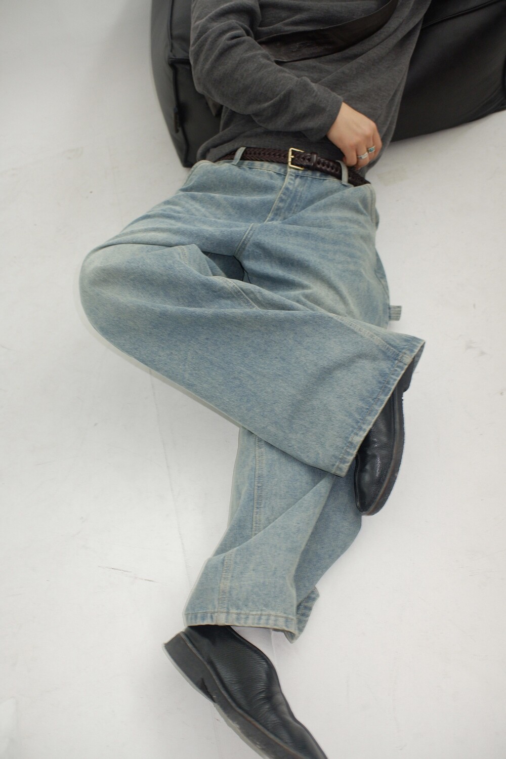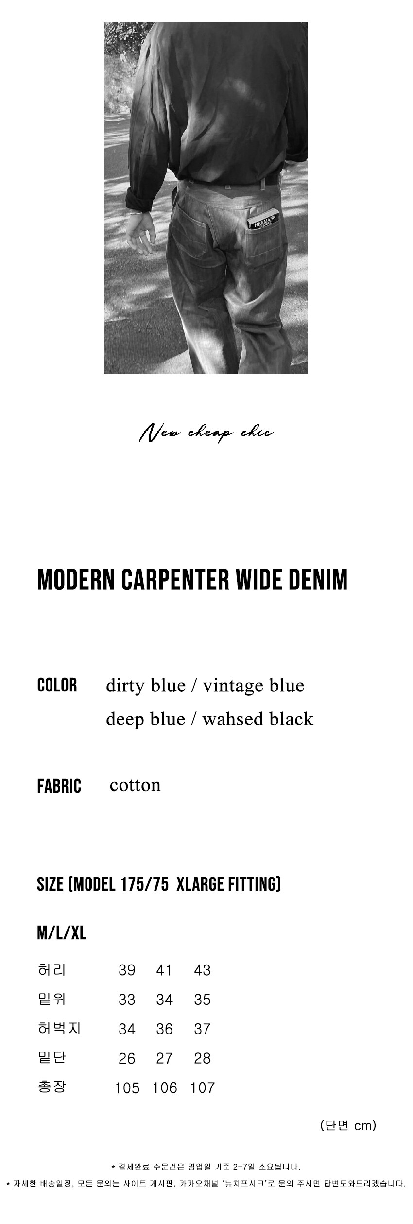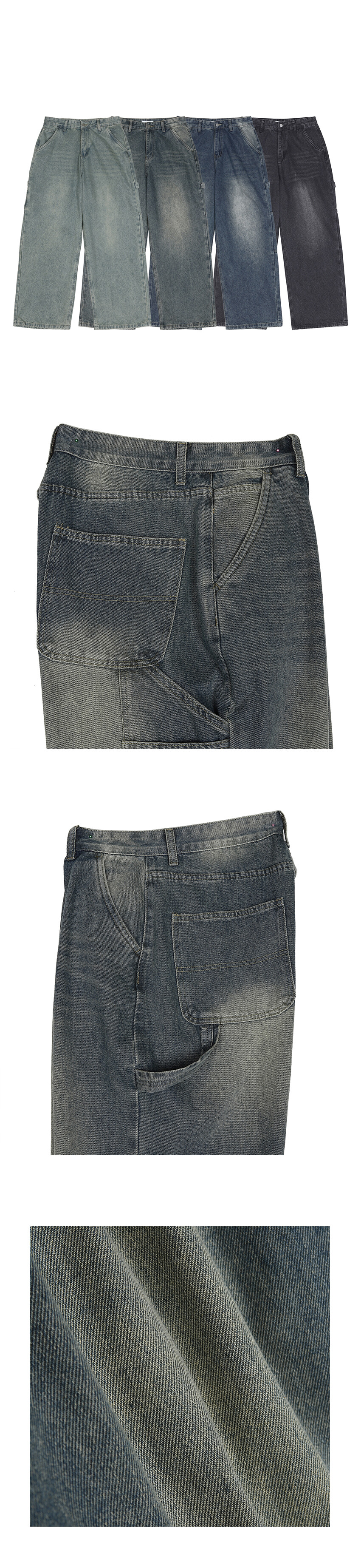 카펜터 팬츠 특유의 워크웨어 디테일을 베이스로 데일리 착용에 적합하도록 정리한 와이드 데님입니다.