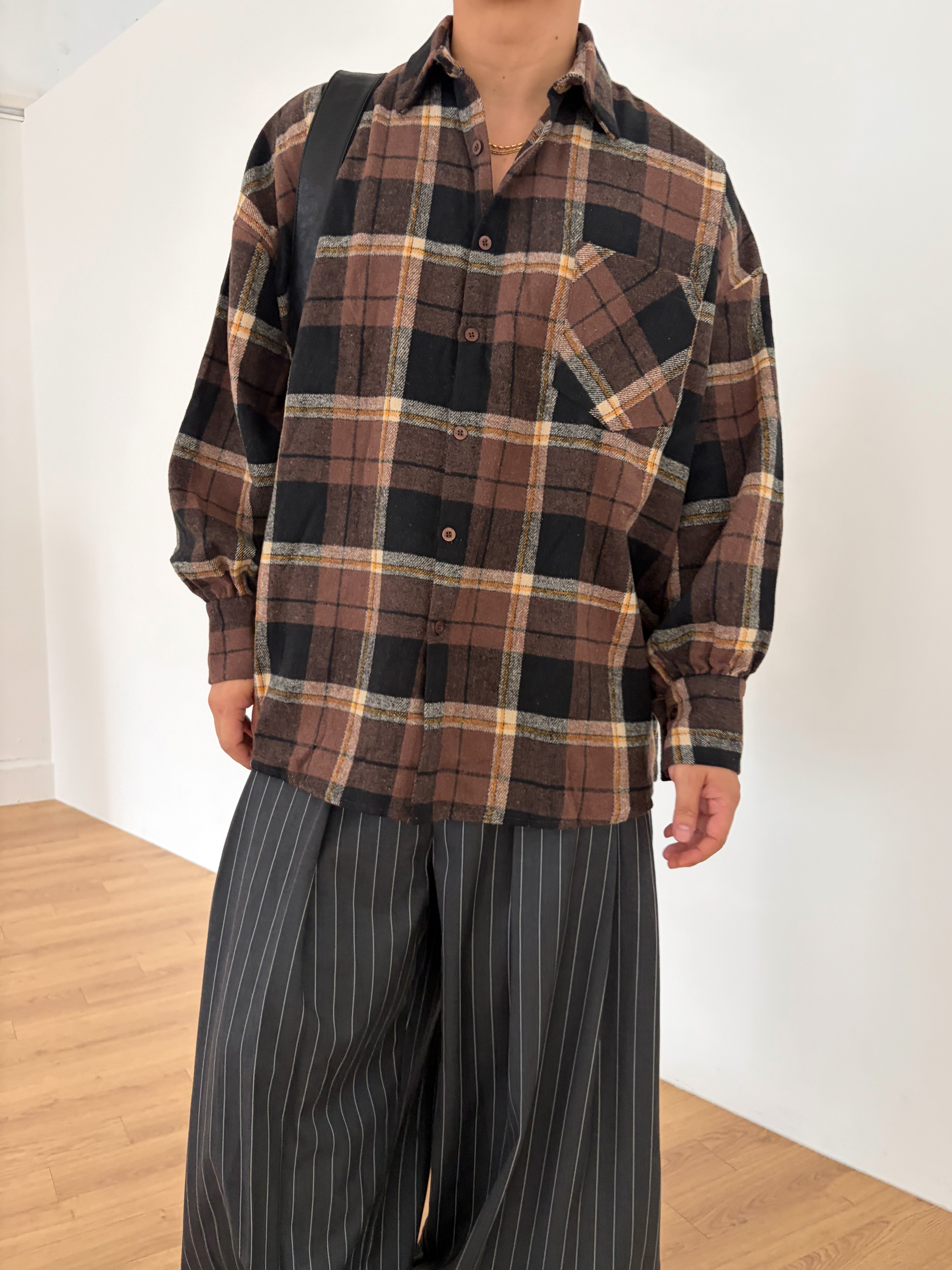 클래식한 체크 패턴의 모직 소재로 제작된 오버핏 셔츠