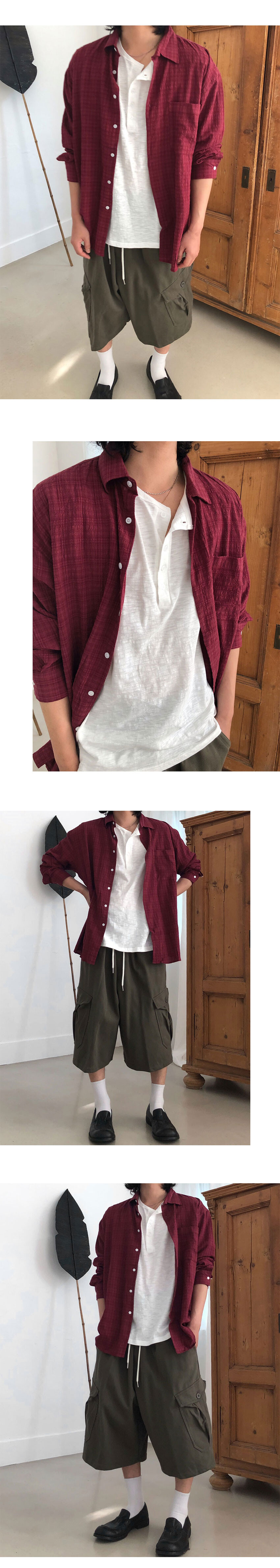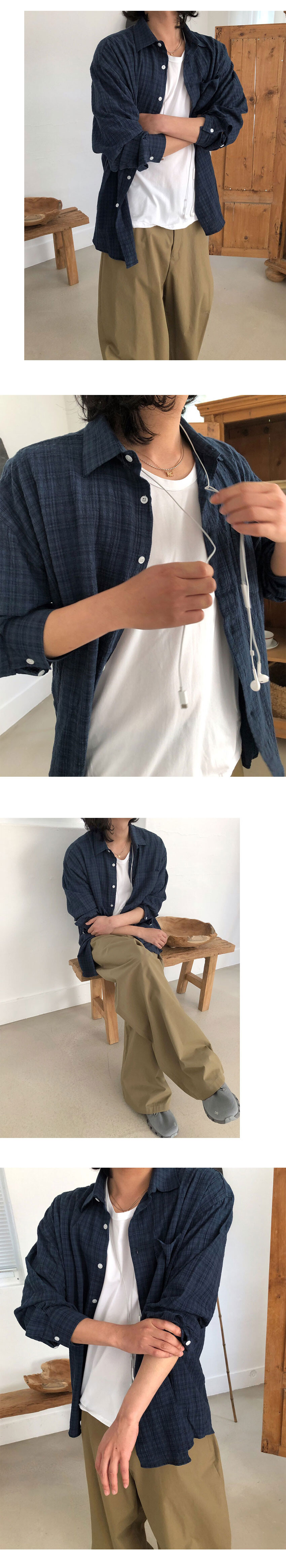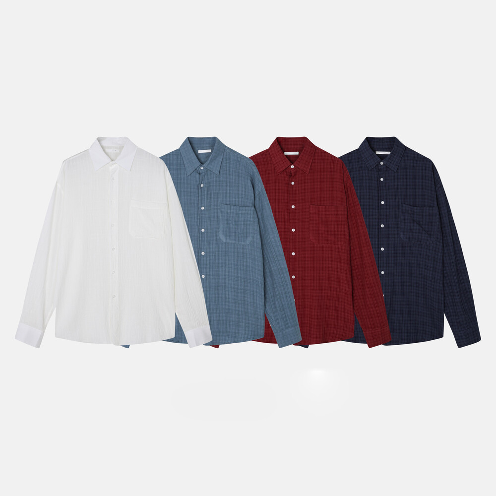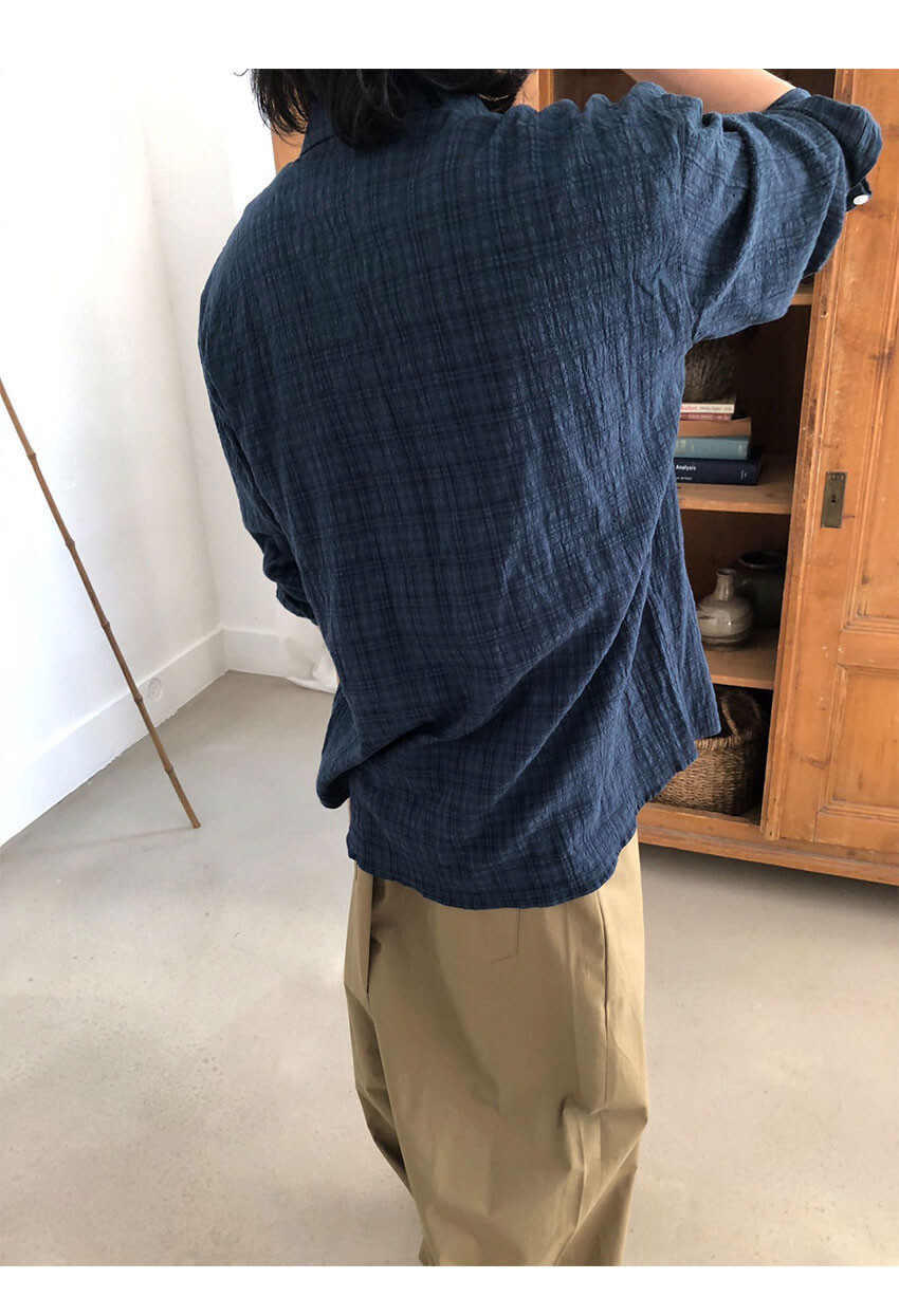 스퀘어 짜임의 체크원단에 워싱가공을 통하여 엠보싱 텍스쳐를 돋보이게 가공
