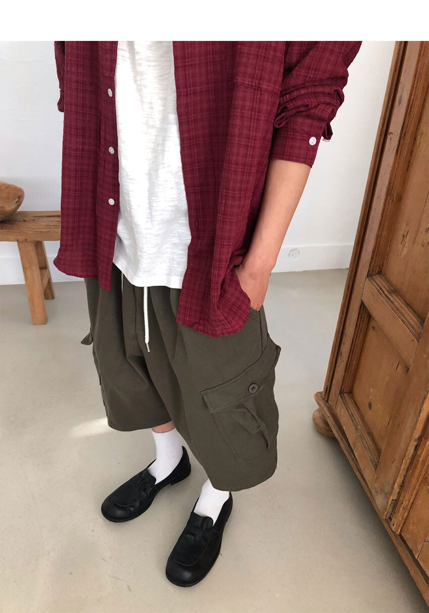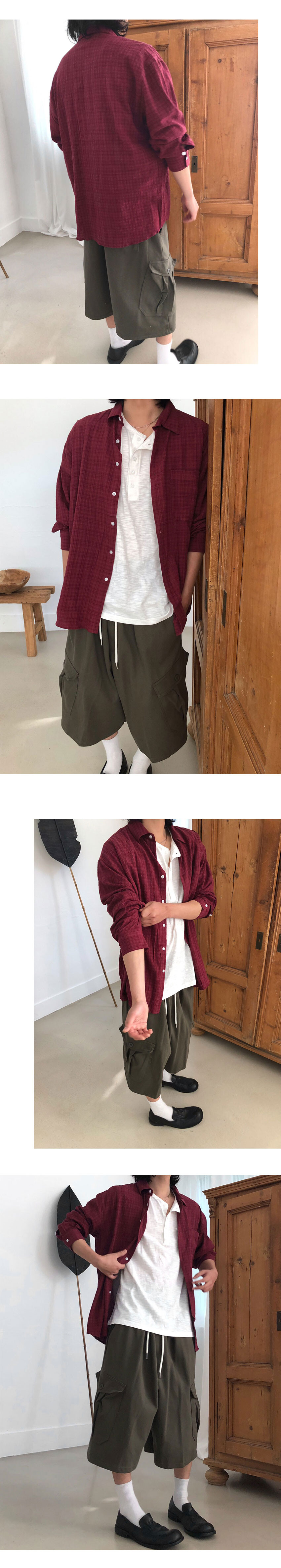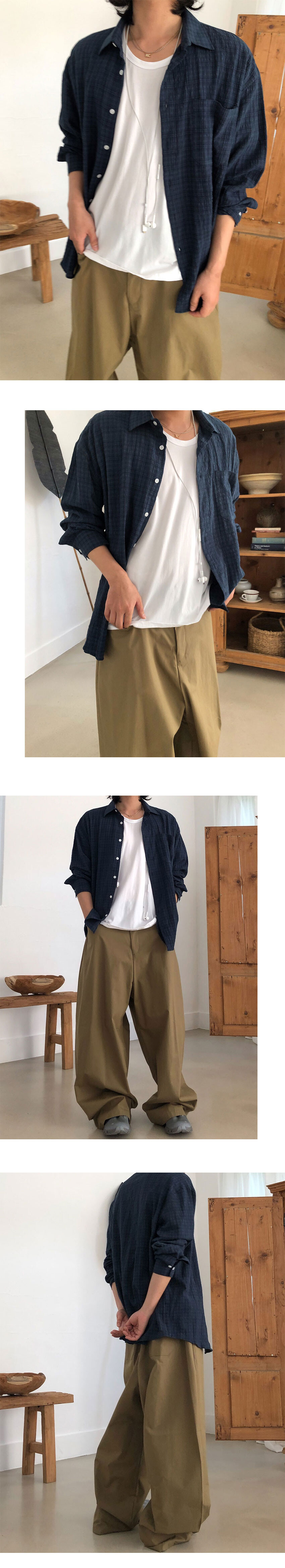 스퀘어 짜임의 체크원단에 워싱가공을 통하여 엠보싱 텍스쳐를 돋보이게 가공