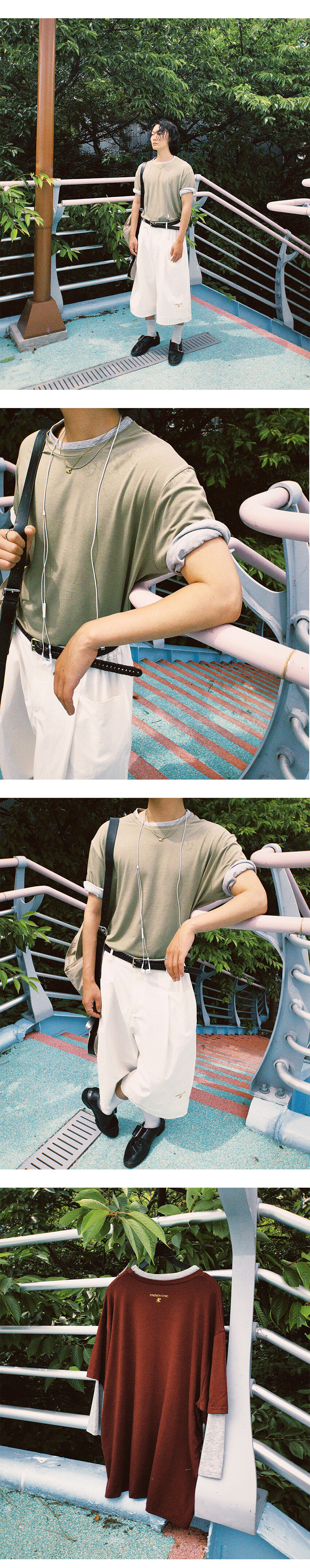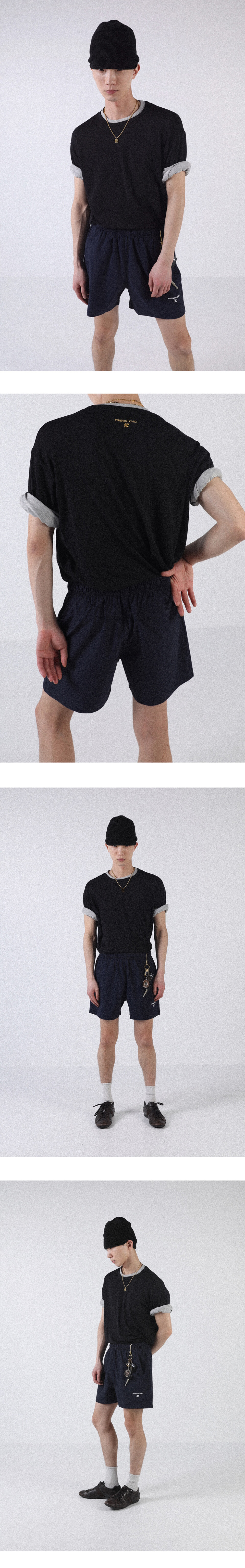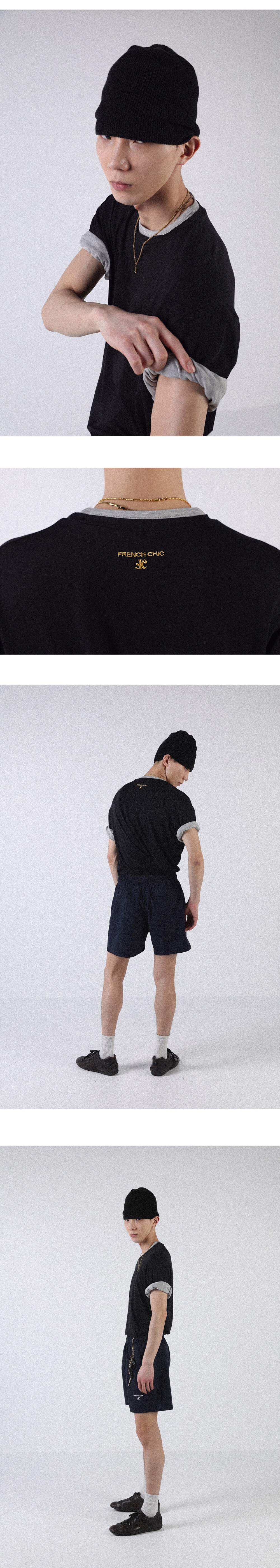 넥과 소매 부분을 이중으로 제작하여 티셔츠 두장을 겹쳐 입은 듯한 디자인으로 레이어드한 모습을 연출했습니다.