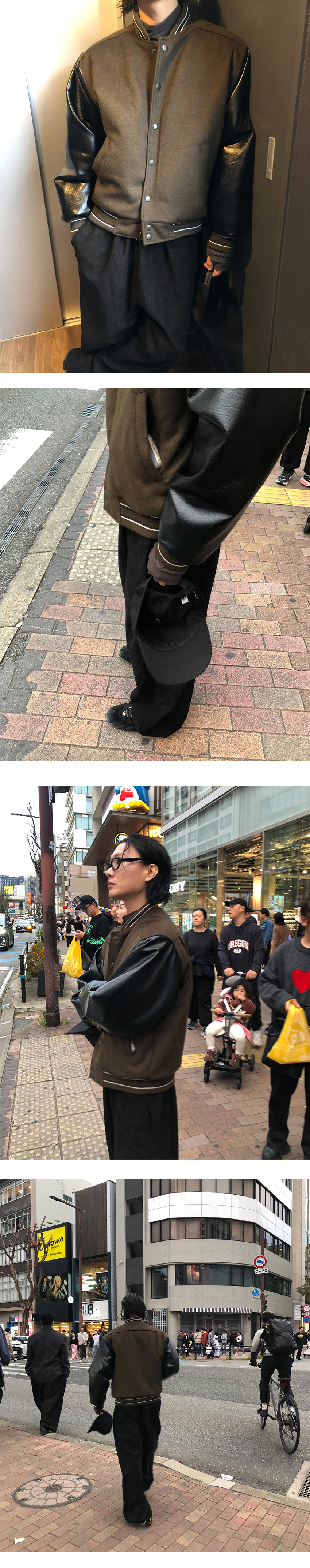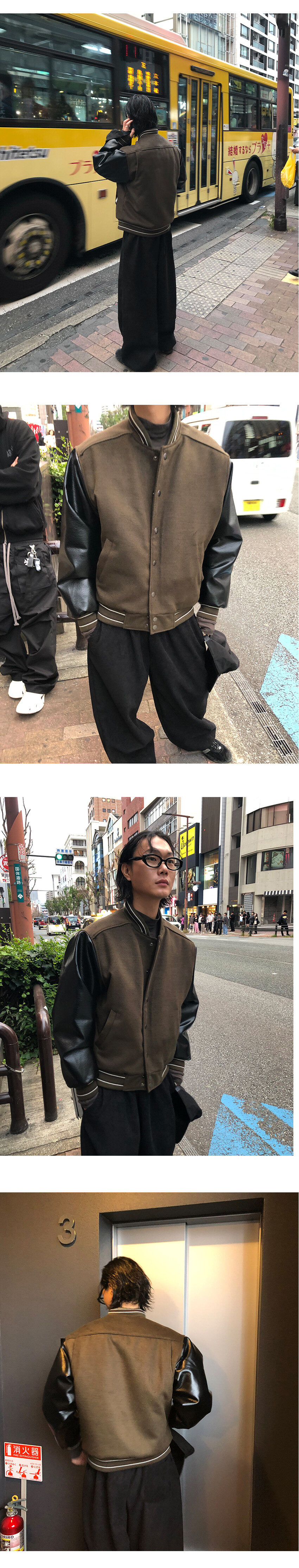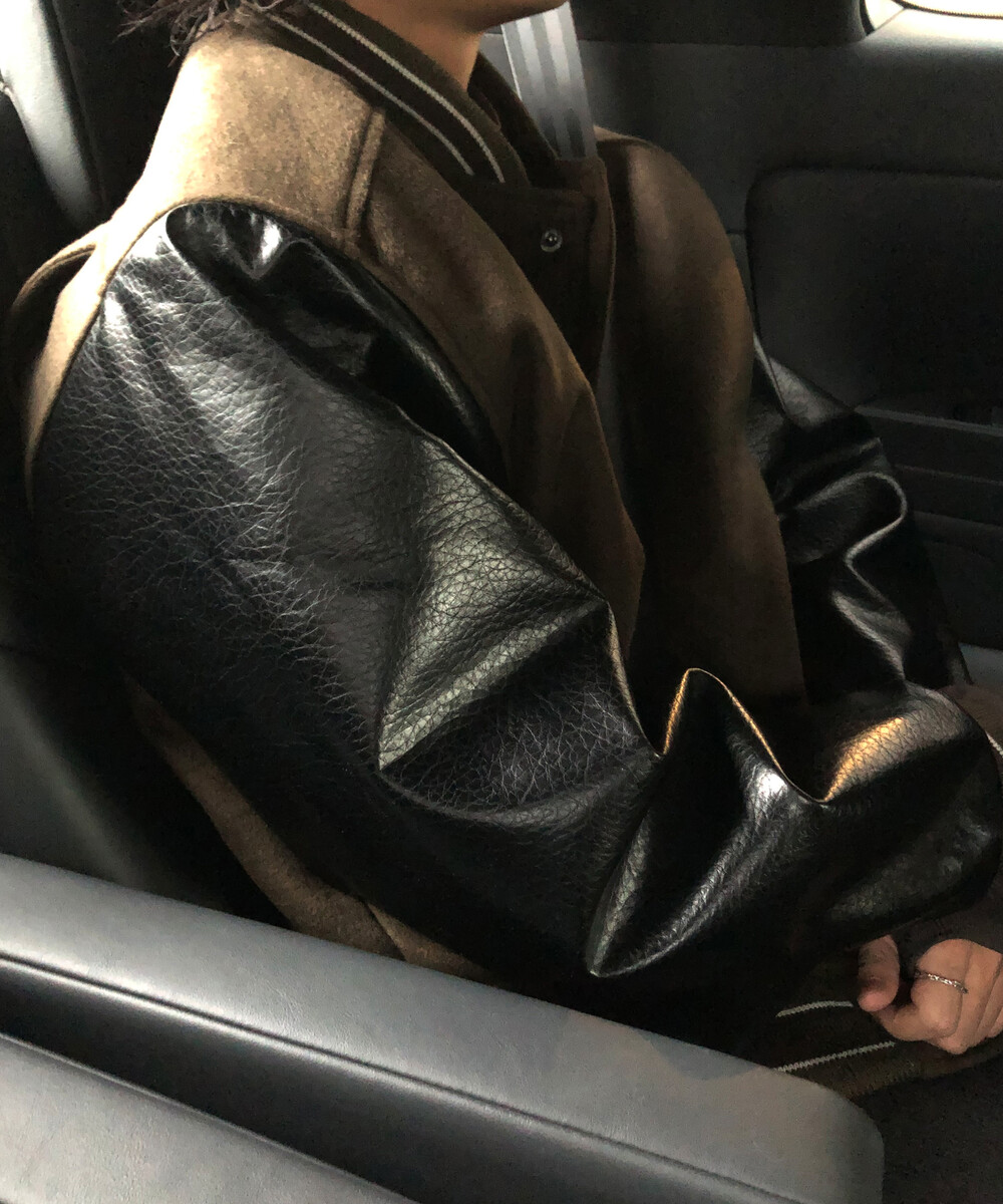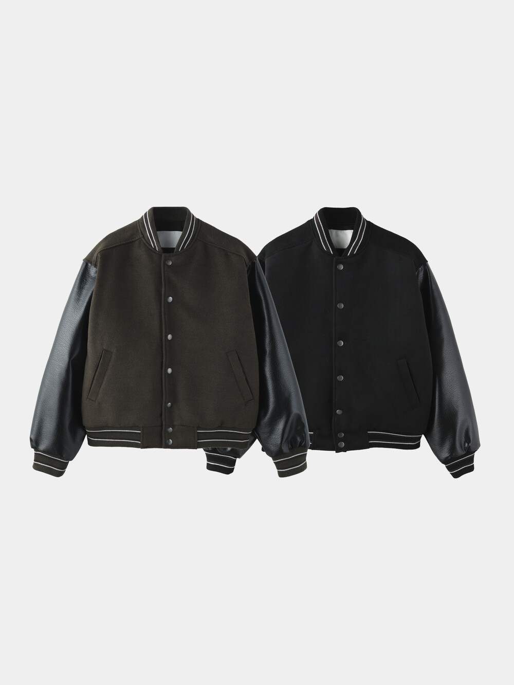 울 바디와 레더 슬리브의 대비가 돋보이는 미니멀 바시티 스타일 아우터입니다.