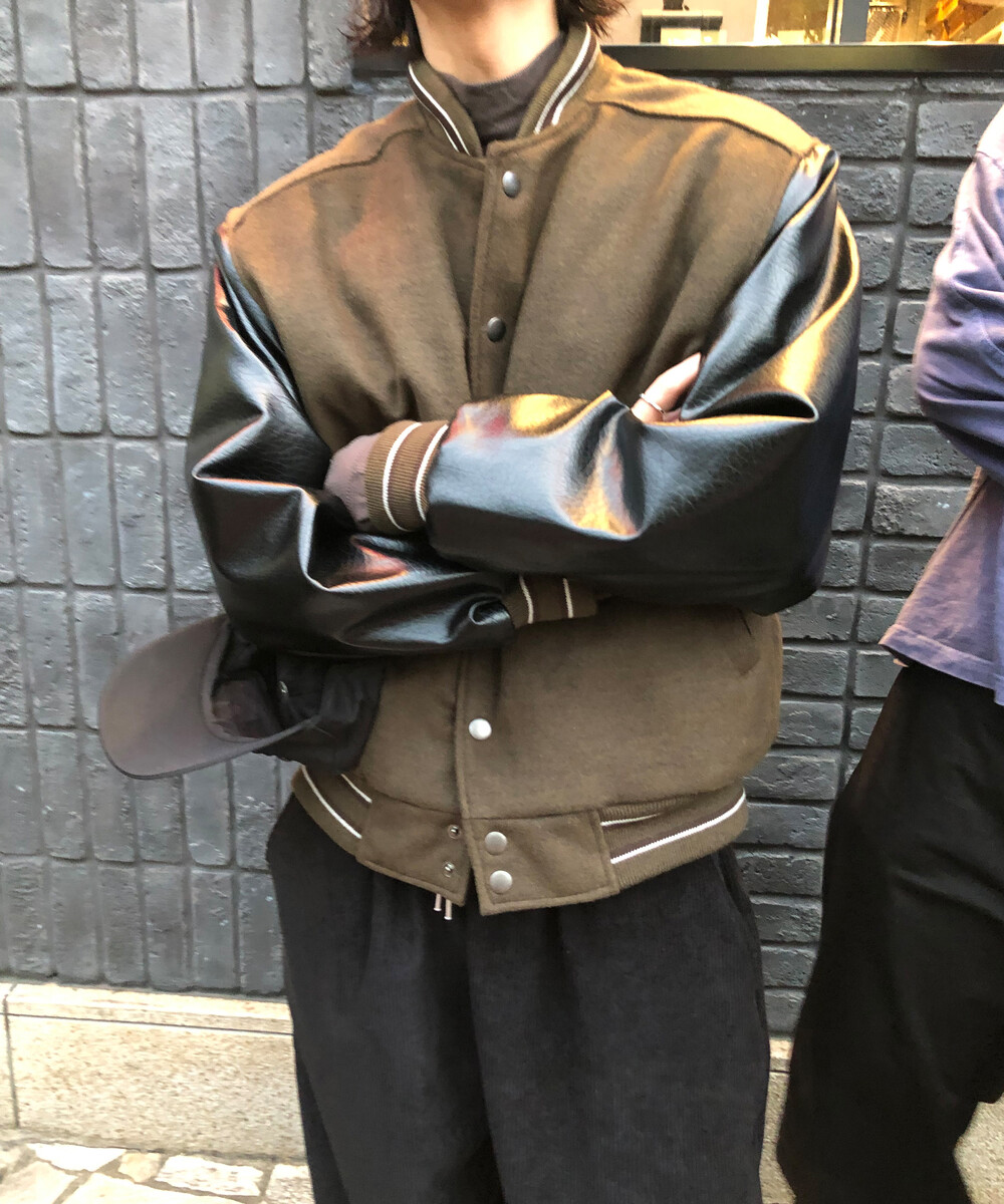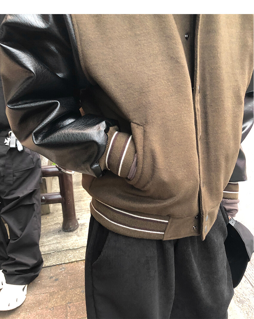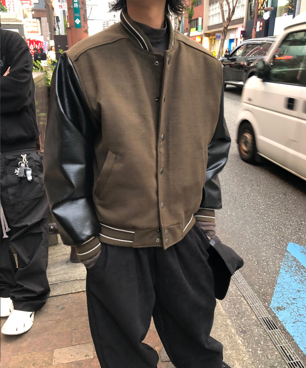 울 바디와 레더 슬리브의 대비가 돋보이는 미니멀 바시티 스타일 아우터입니다.