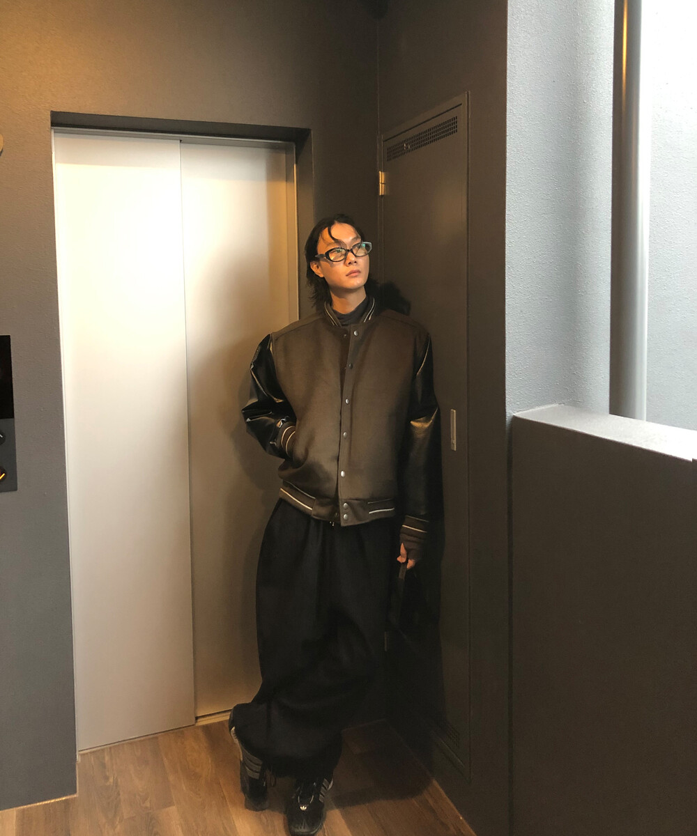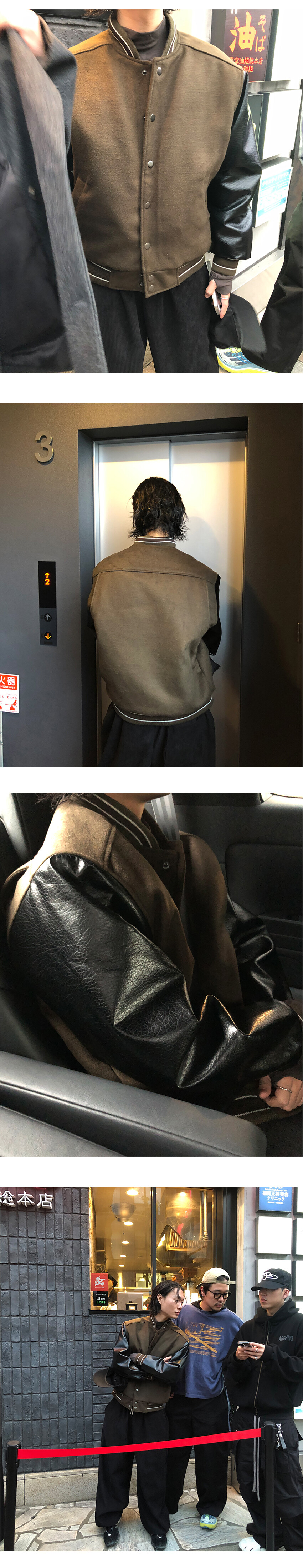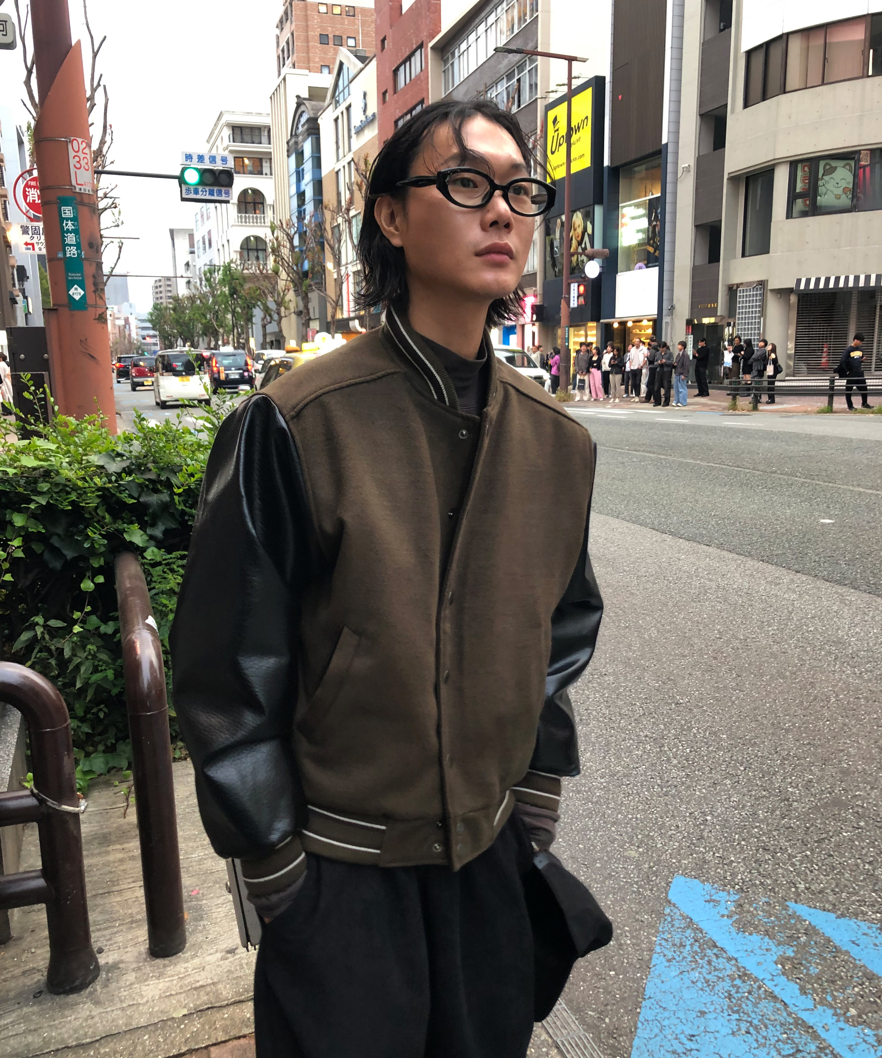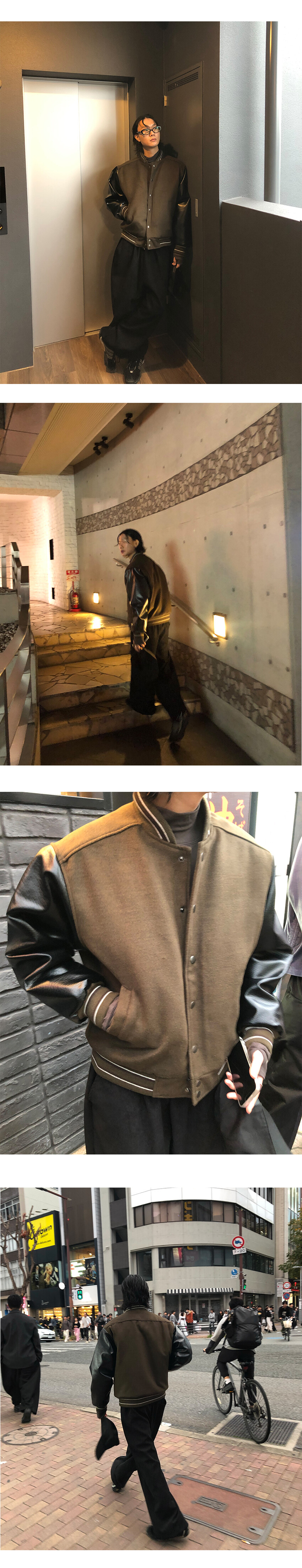울 바디와 레더 슬리브의 대비가 돋보이는 미니멀 바시티 스타일 아우터입니다.