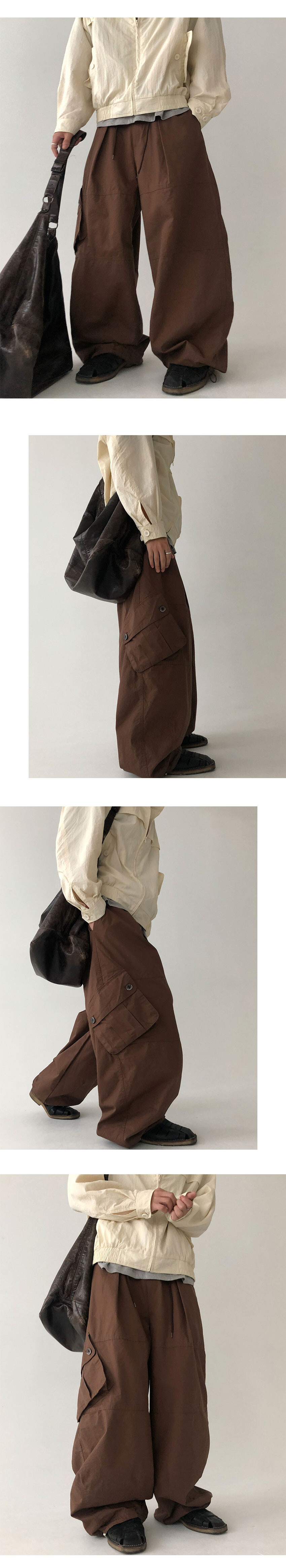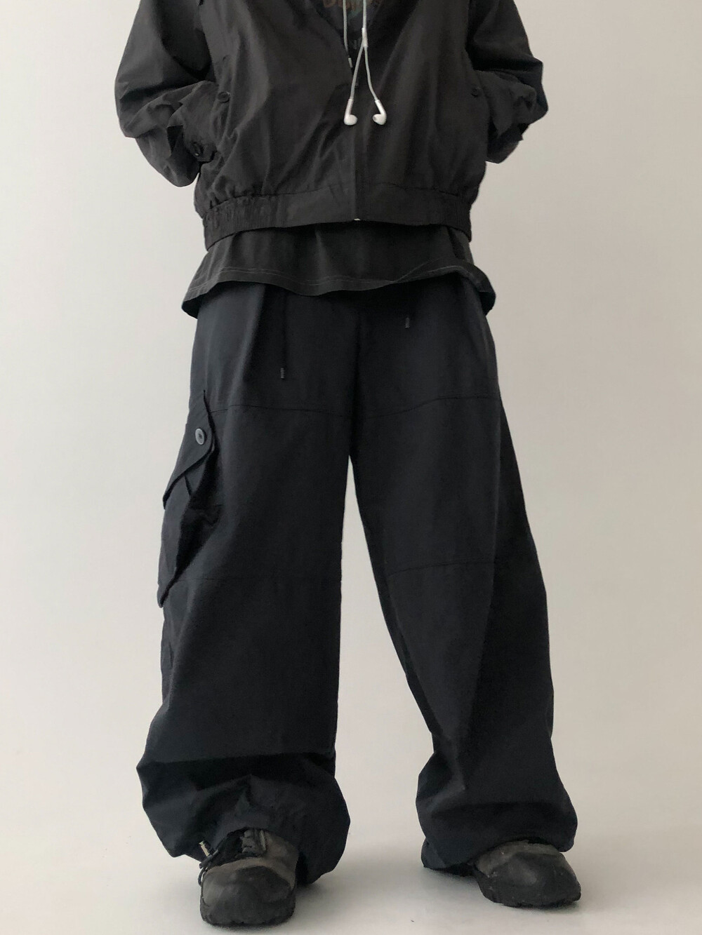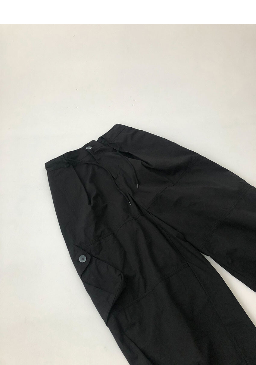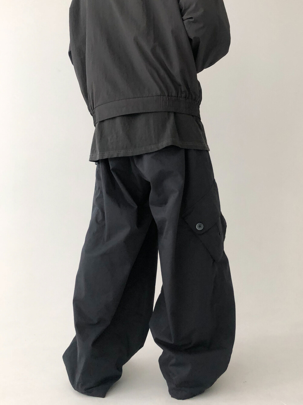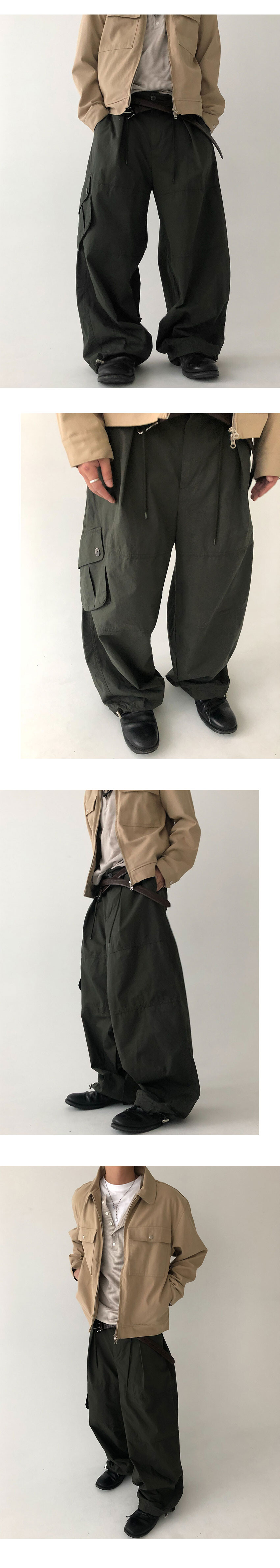 비대칭 카고 포켓, 전면 원턱, 절개라인, 밑단 스트링