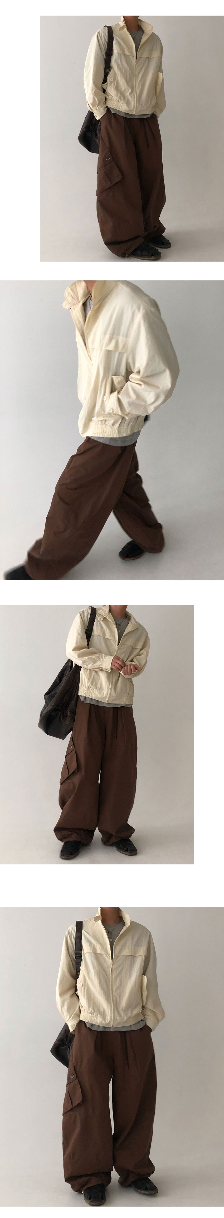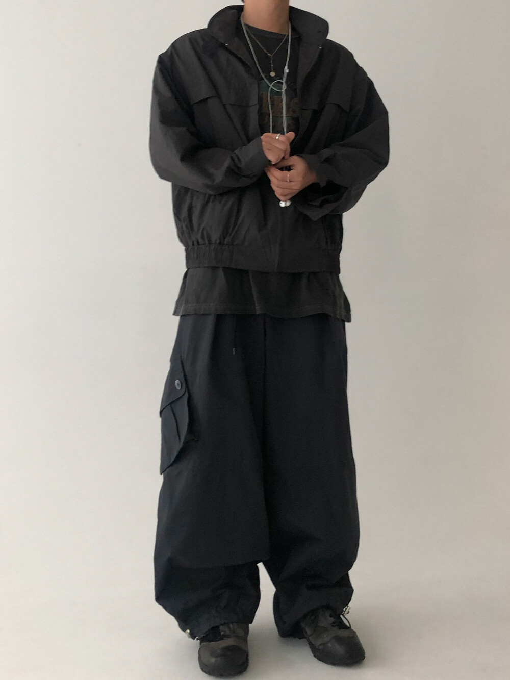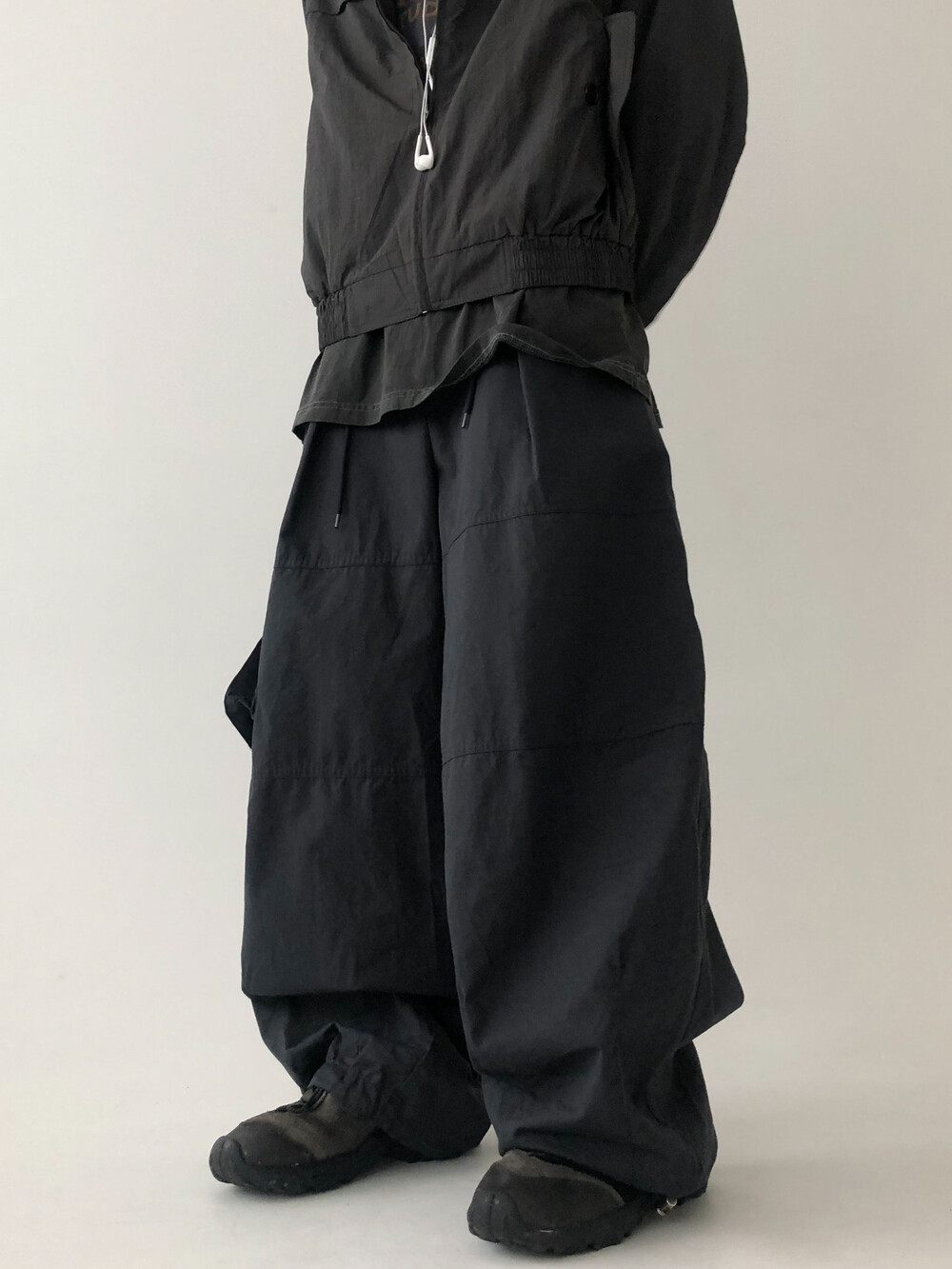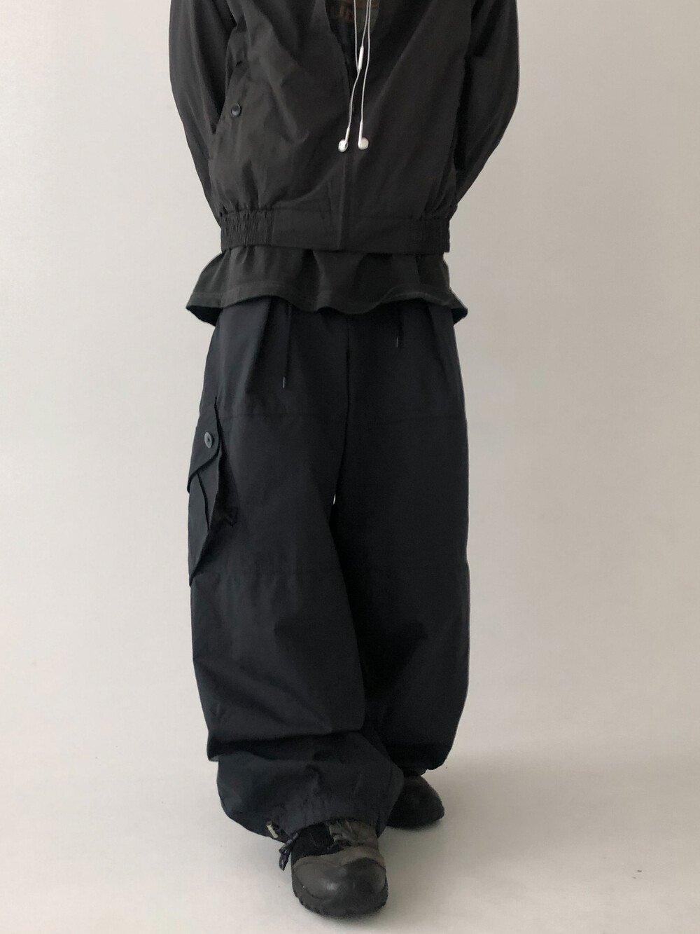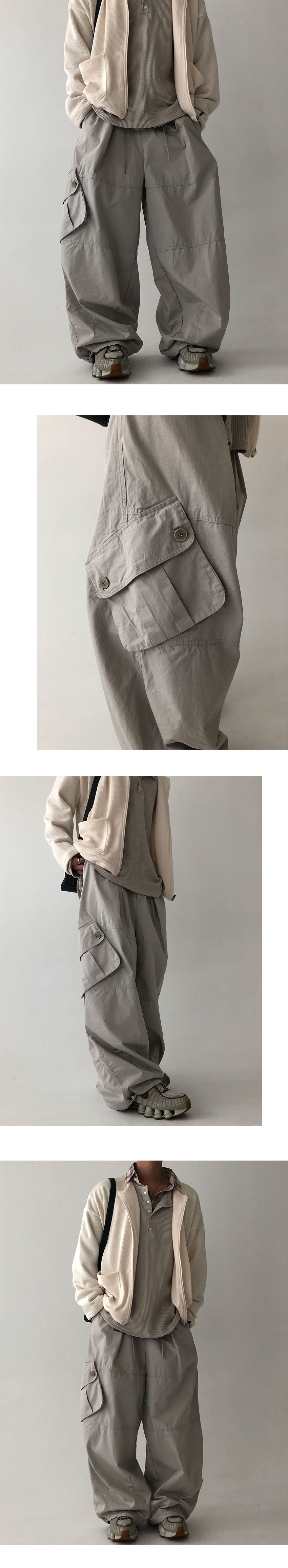 비대칭 카고 포켓, 전면 원턱, 절개라인, 밑단 스트링