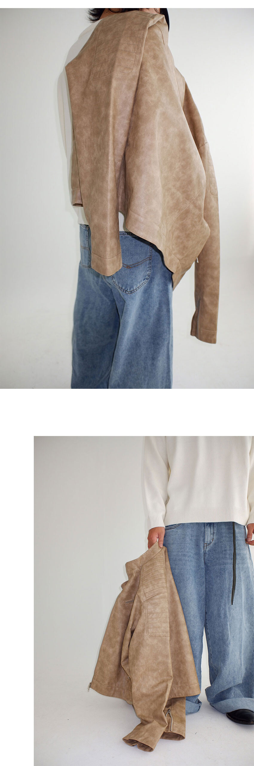 숄더 부분 패드 퀼딩 디테일로 바이커 자켓과 같은 분위기 연출