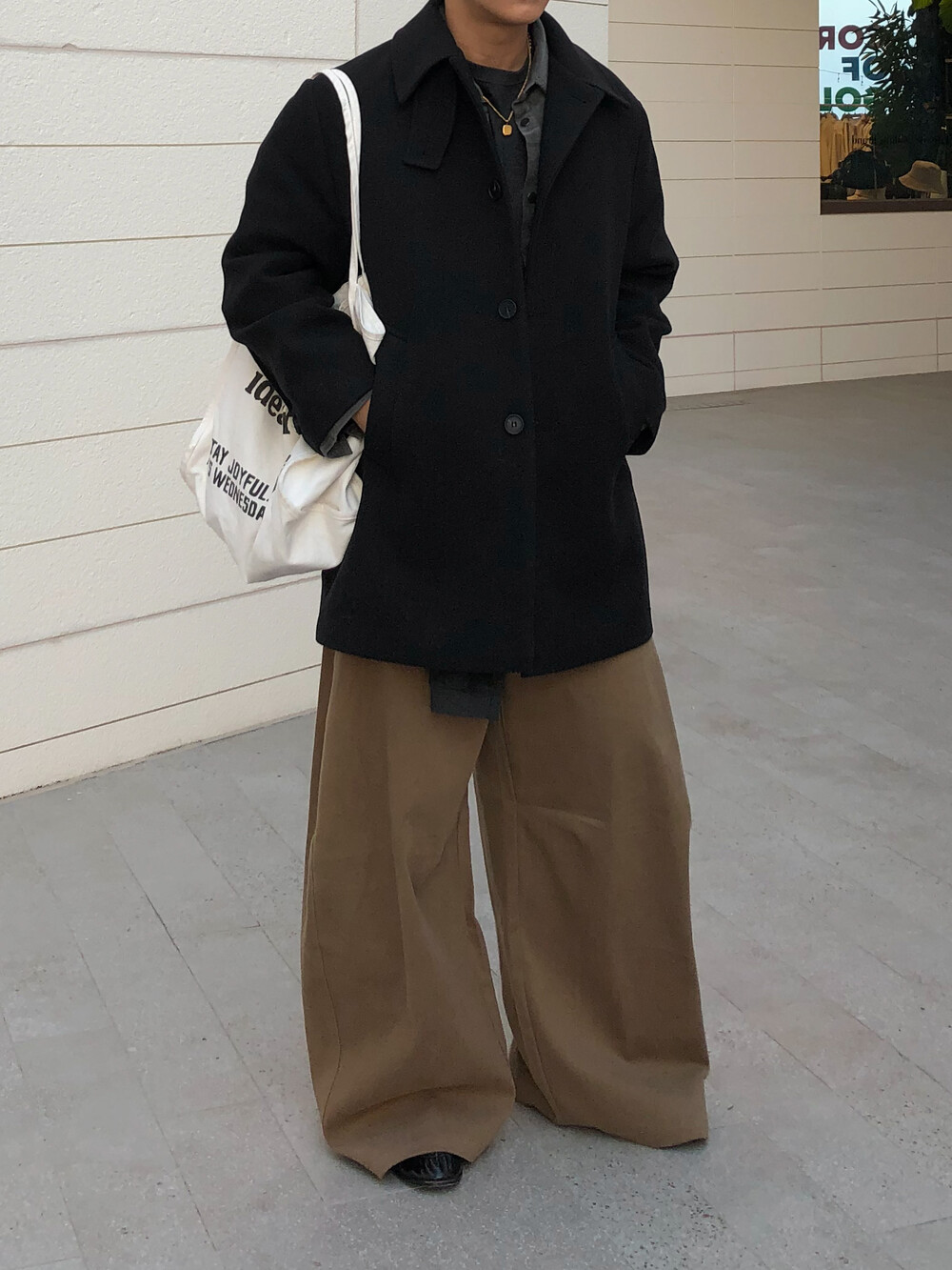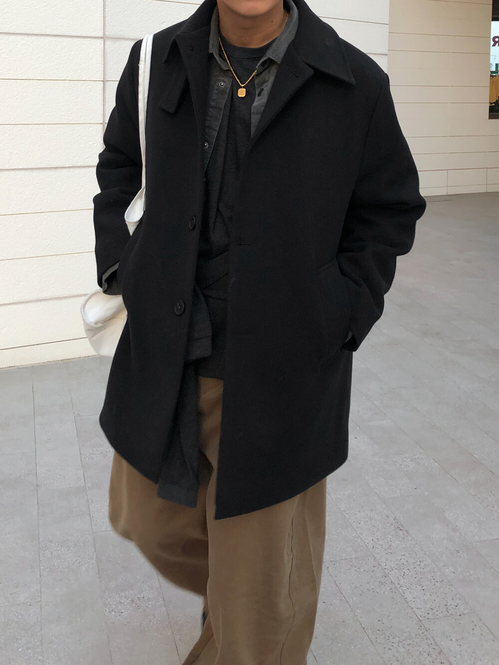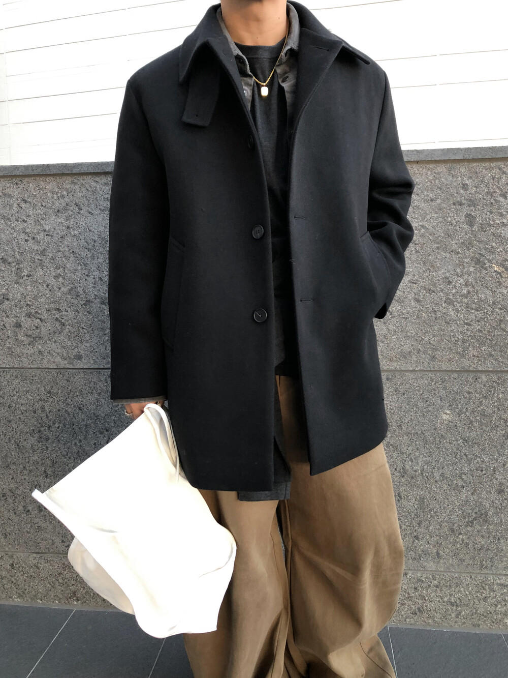 하프한 기장감으로 제작된 코트로, 전체적인 균형이 깔끔하게 떨어지는 실루엣이 특징입니다.