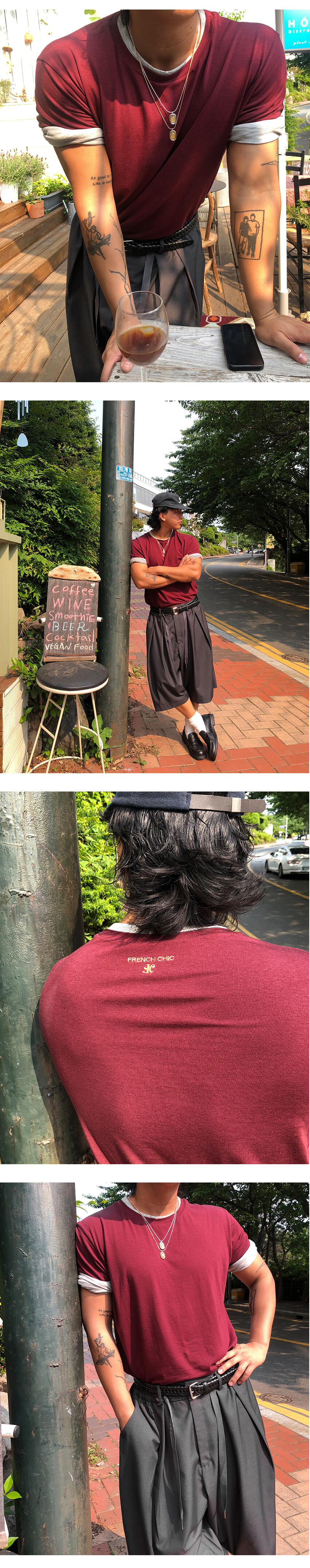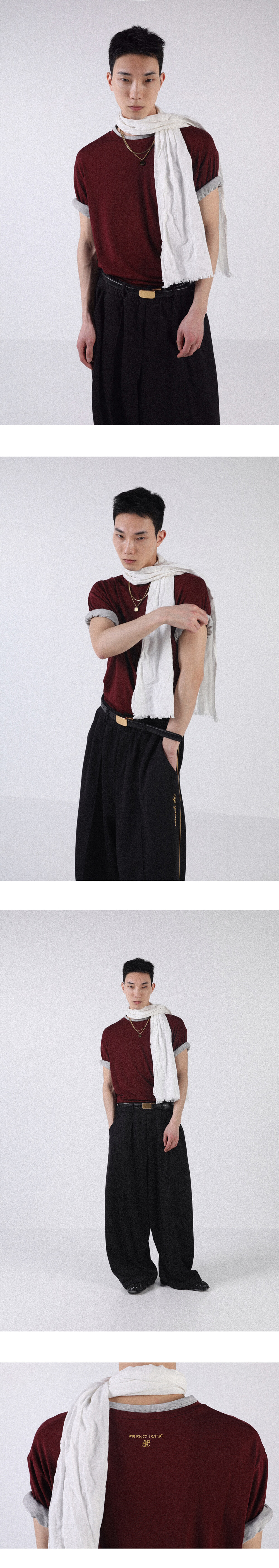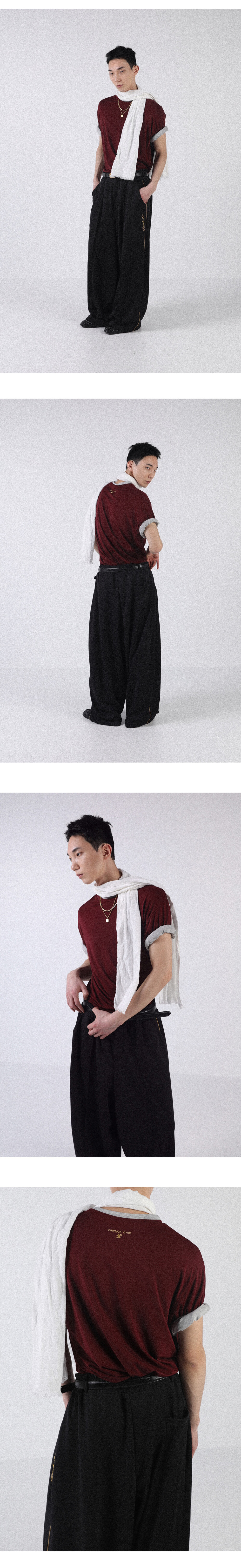 넥과 소매 부분을 이중으로 제작하여 티셔츠 두장을 겹쳐 입은 듯한 디자인으로 레이어드한 모습을 연출했습니다.