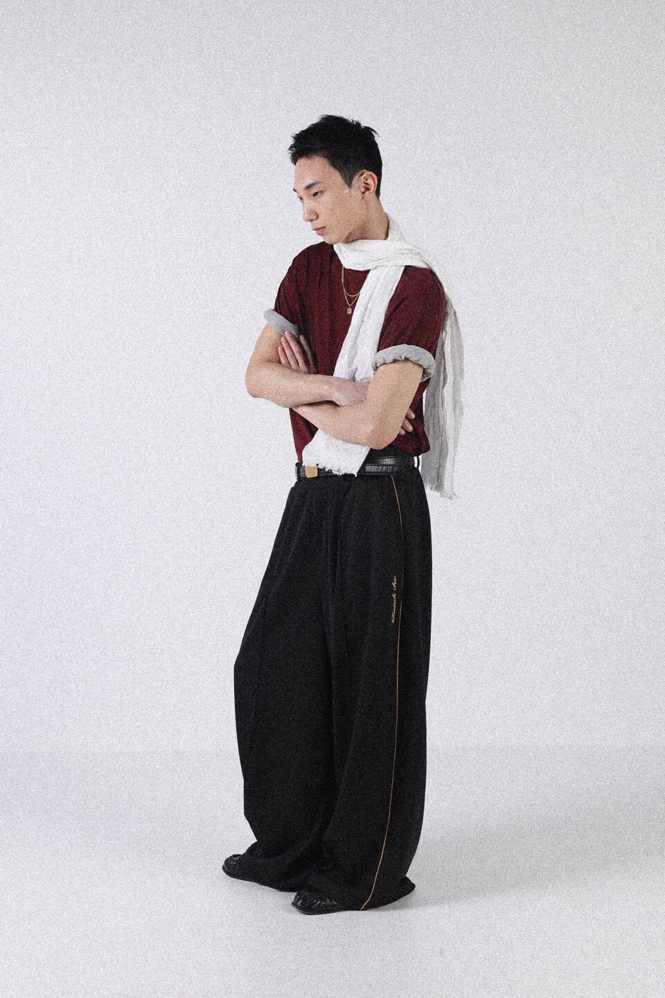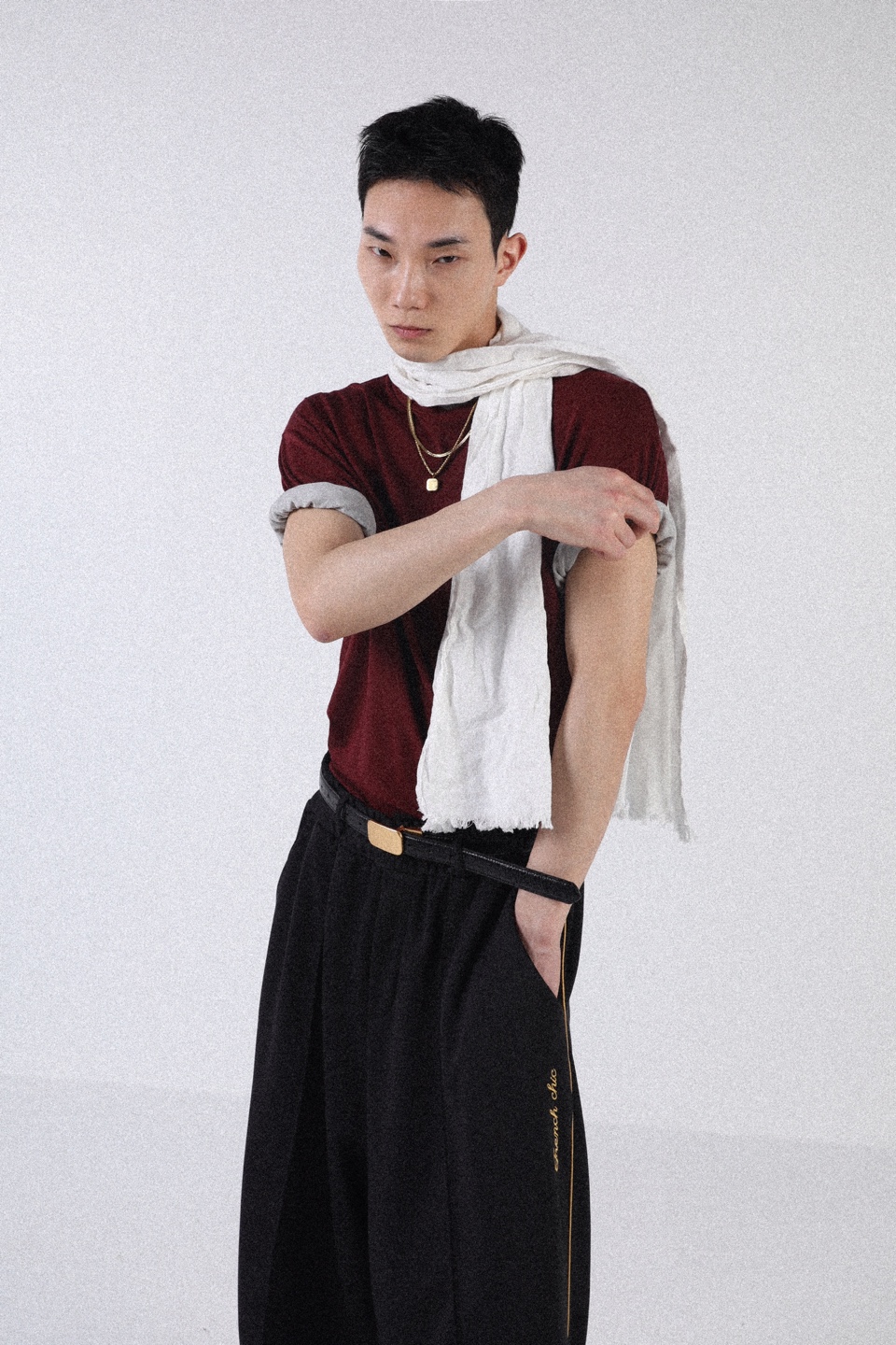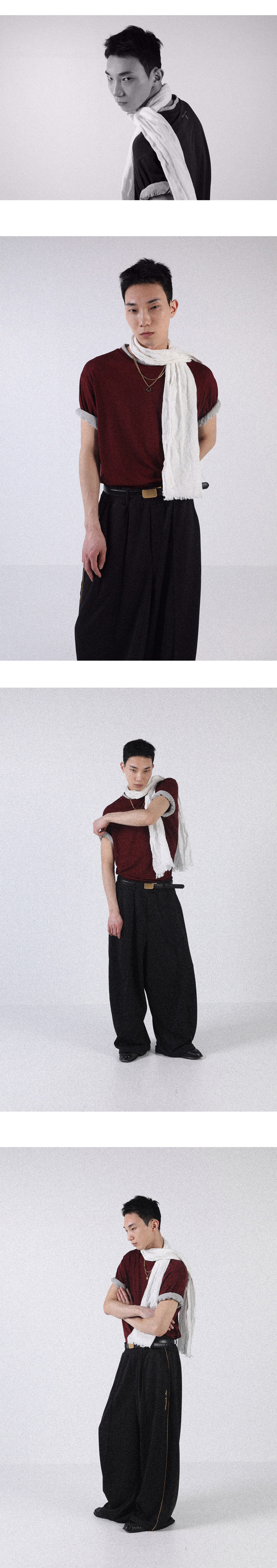 넥과 소매 부분을 이중으로 제작하여 티셔츠 두장을 겹쳐 입은 듯한 디자인으로 레이어드한 모습을 연출했습니다.