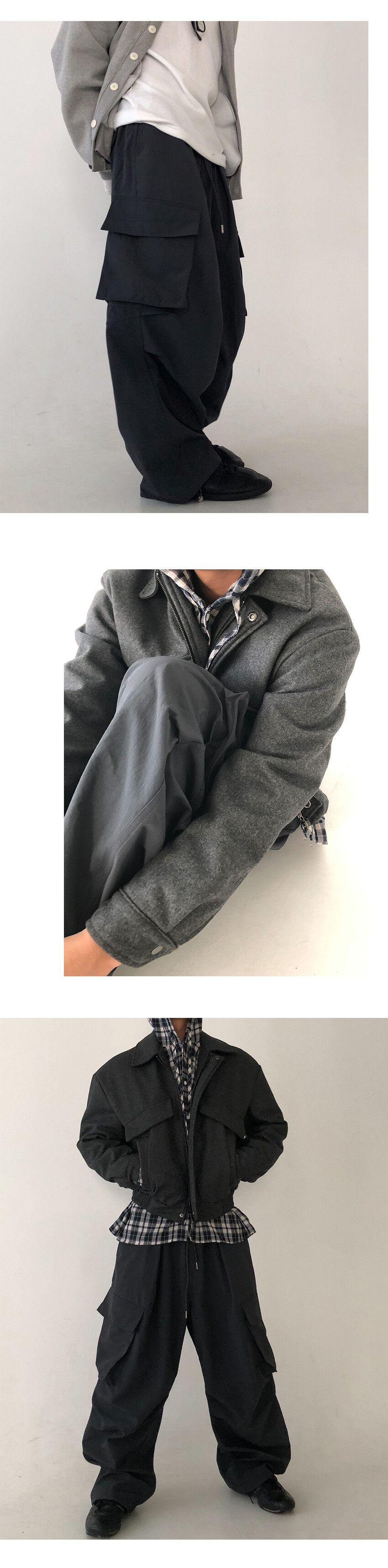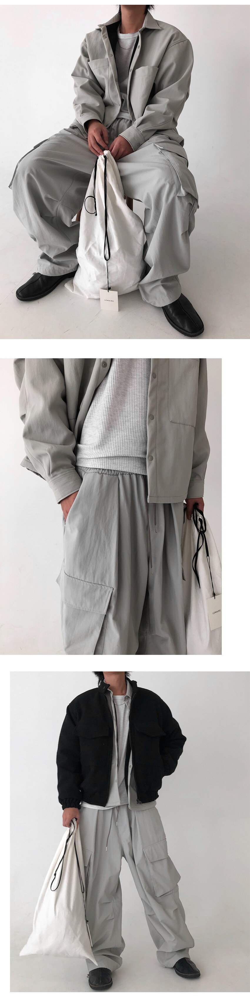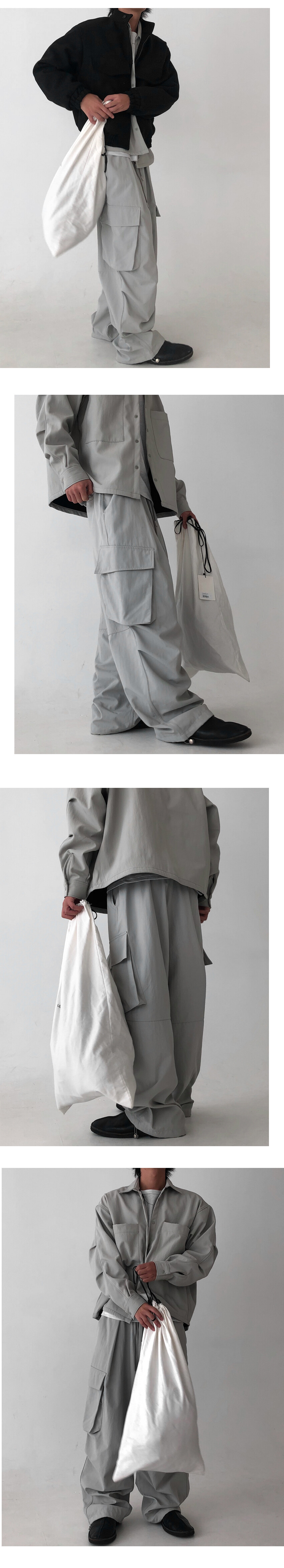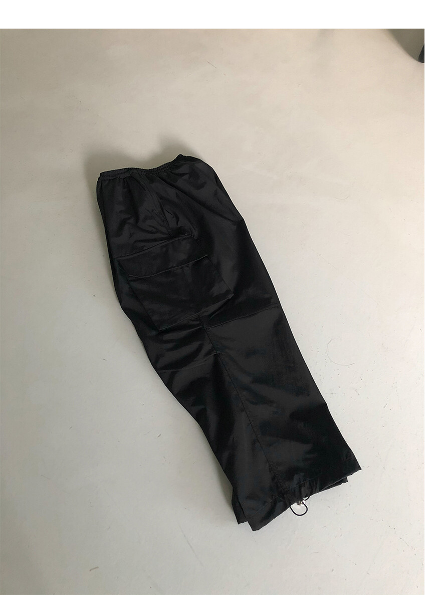 나일론 원단 특성상 가을/겨울 시즌 착용시 차가운 느낌을 보완하기 위해 안쪽 면에 싱글원단으로 합포를 하여 제작한 카고바지