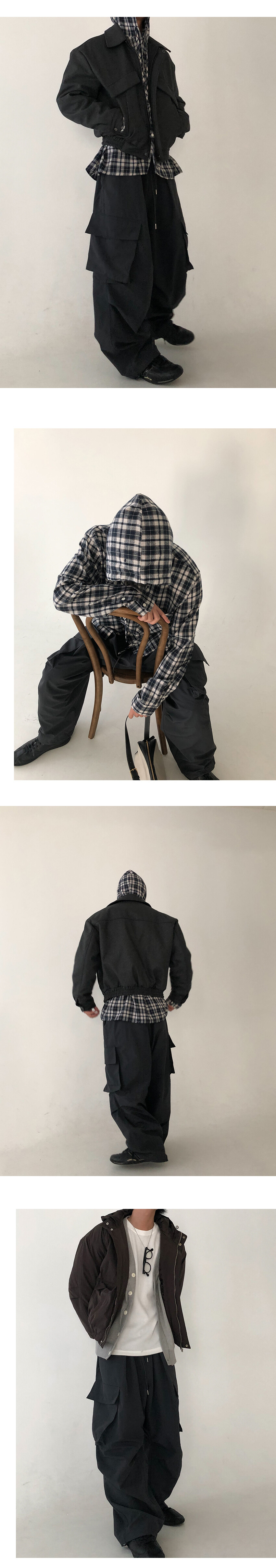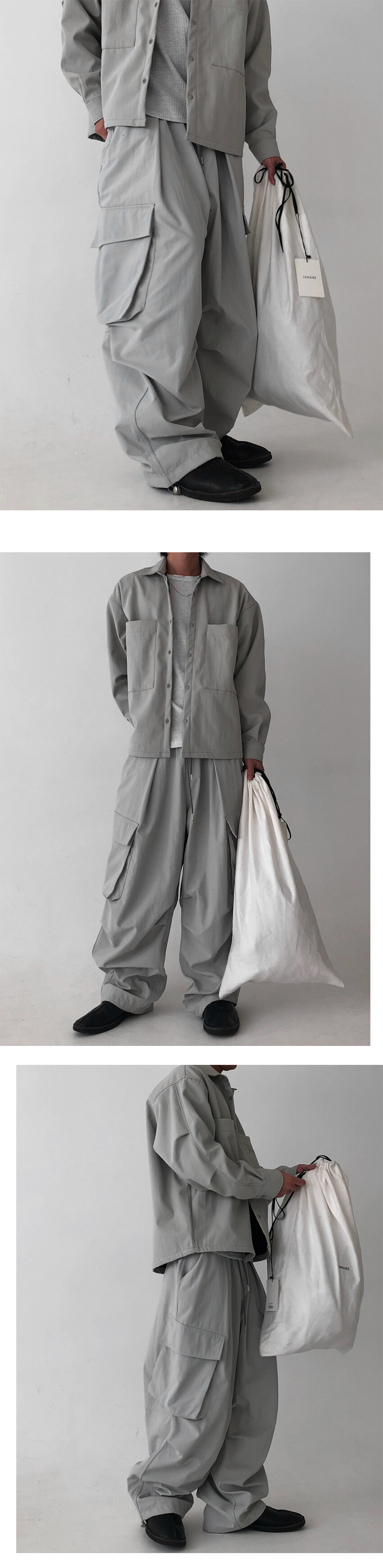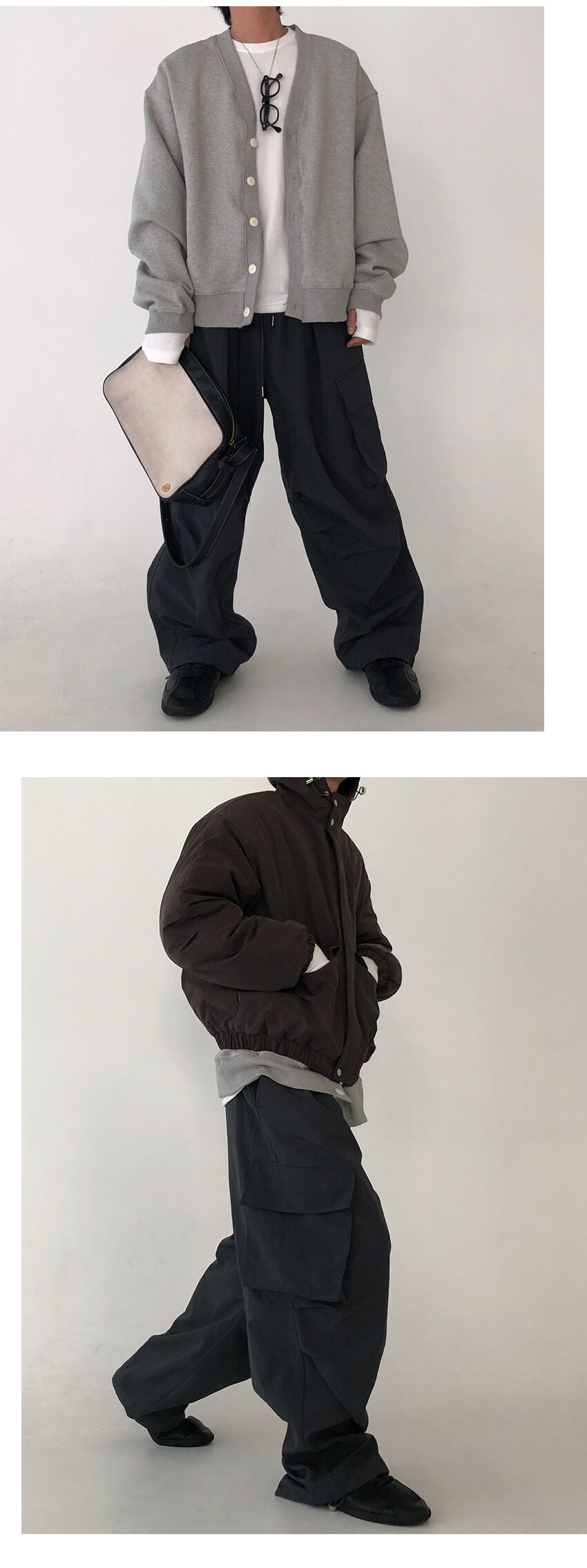나일론 원단 특성상 가을/겨울 시즌 착용시 차가운 느낌을 보완하기 위해 안쪽 면에 싱글원단으로 합포를 하여 제작한 카고바지