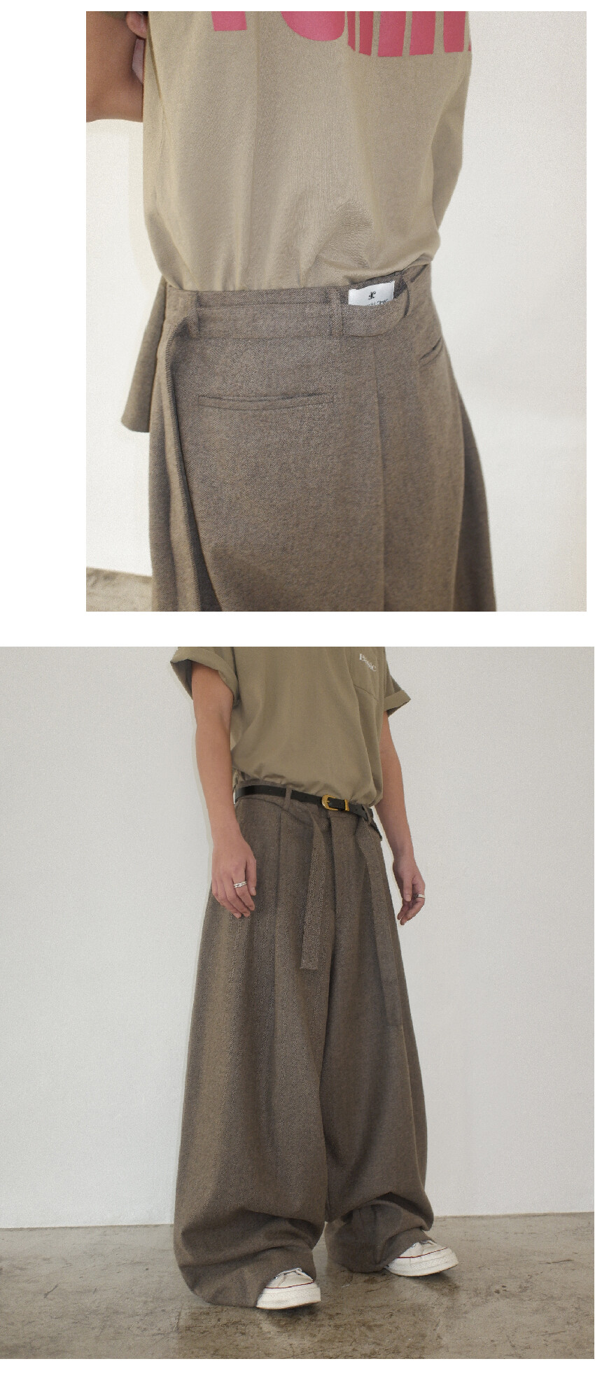 벨티드 디테일 (탈 부착 가능)과 뒷판 허리 오비에 라벨을 추가하여 디자인에 포인트를 주었습니다.