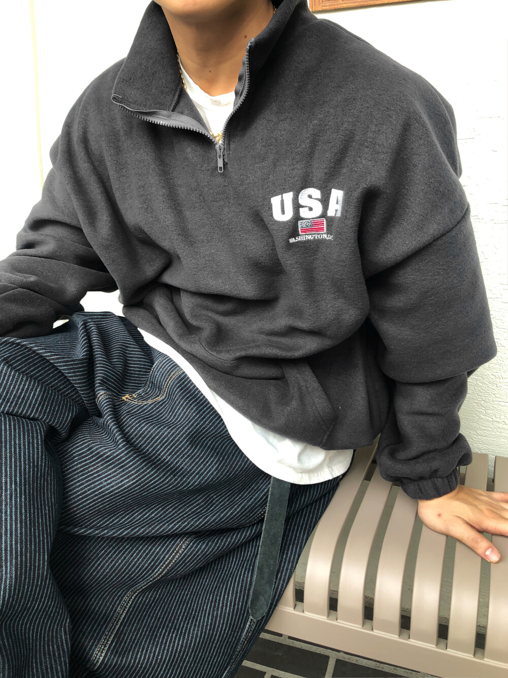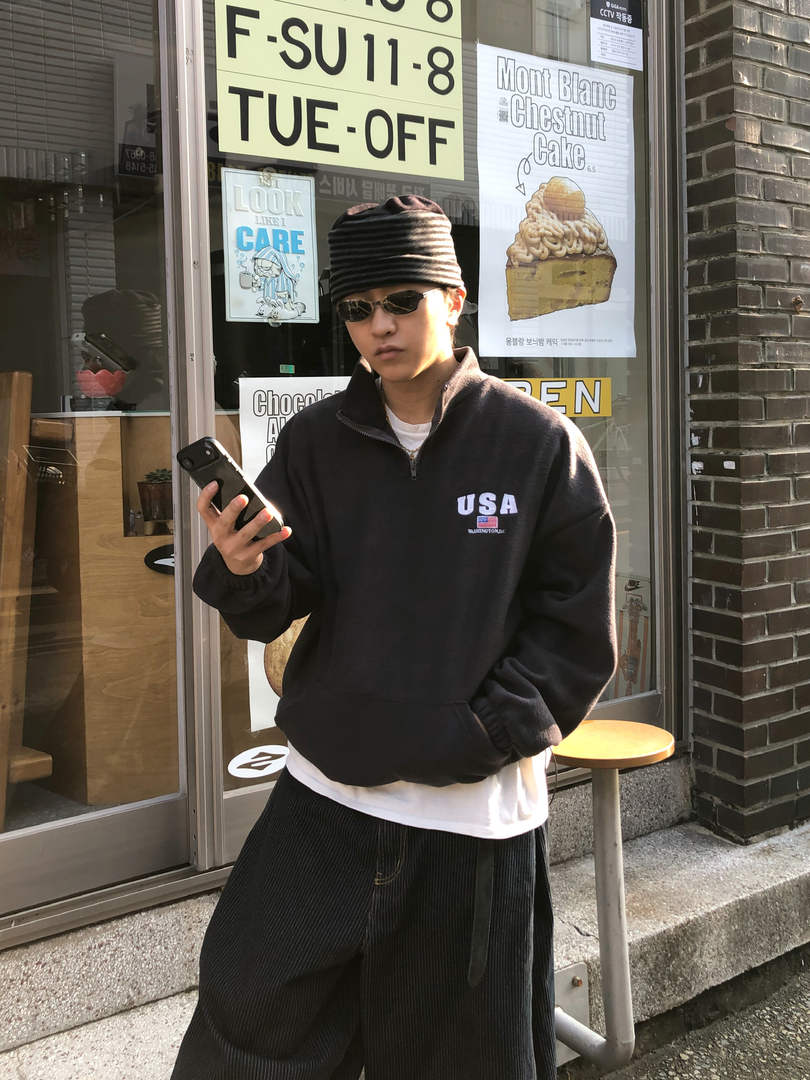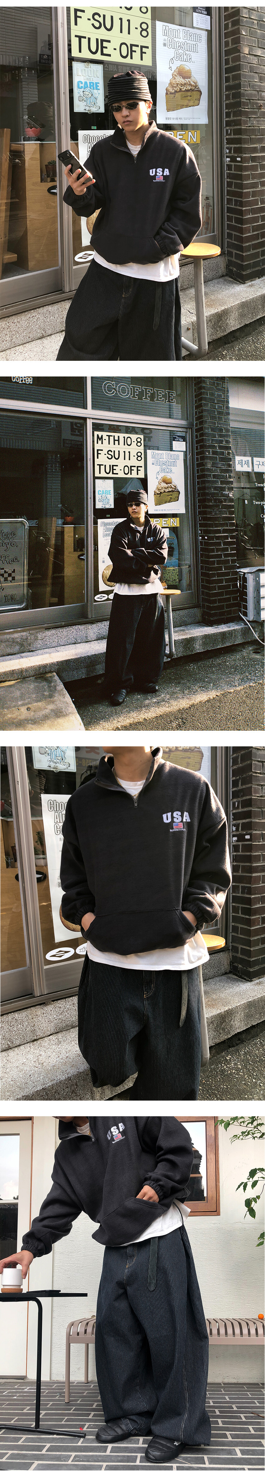 전면의 USA 자수 포인트가 캐주얼한 무드를 더해주는 플리스 반집업 아노락입니다.