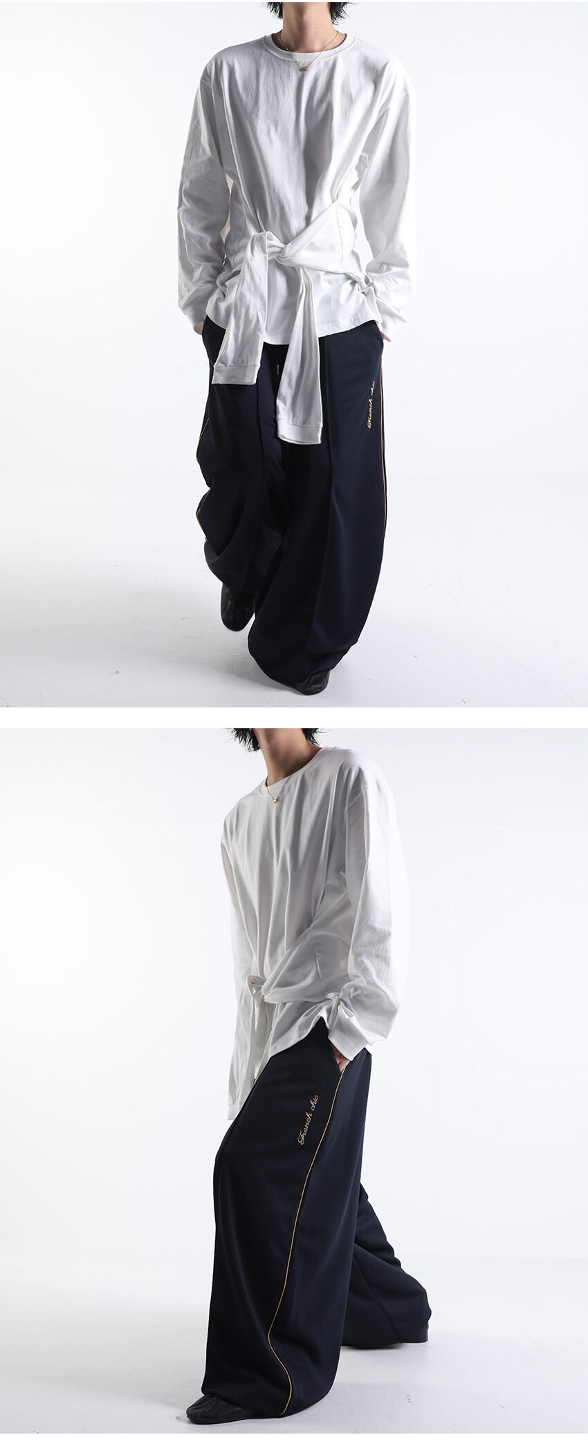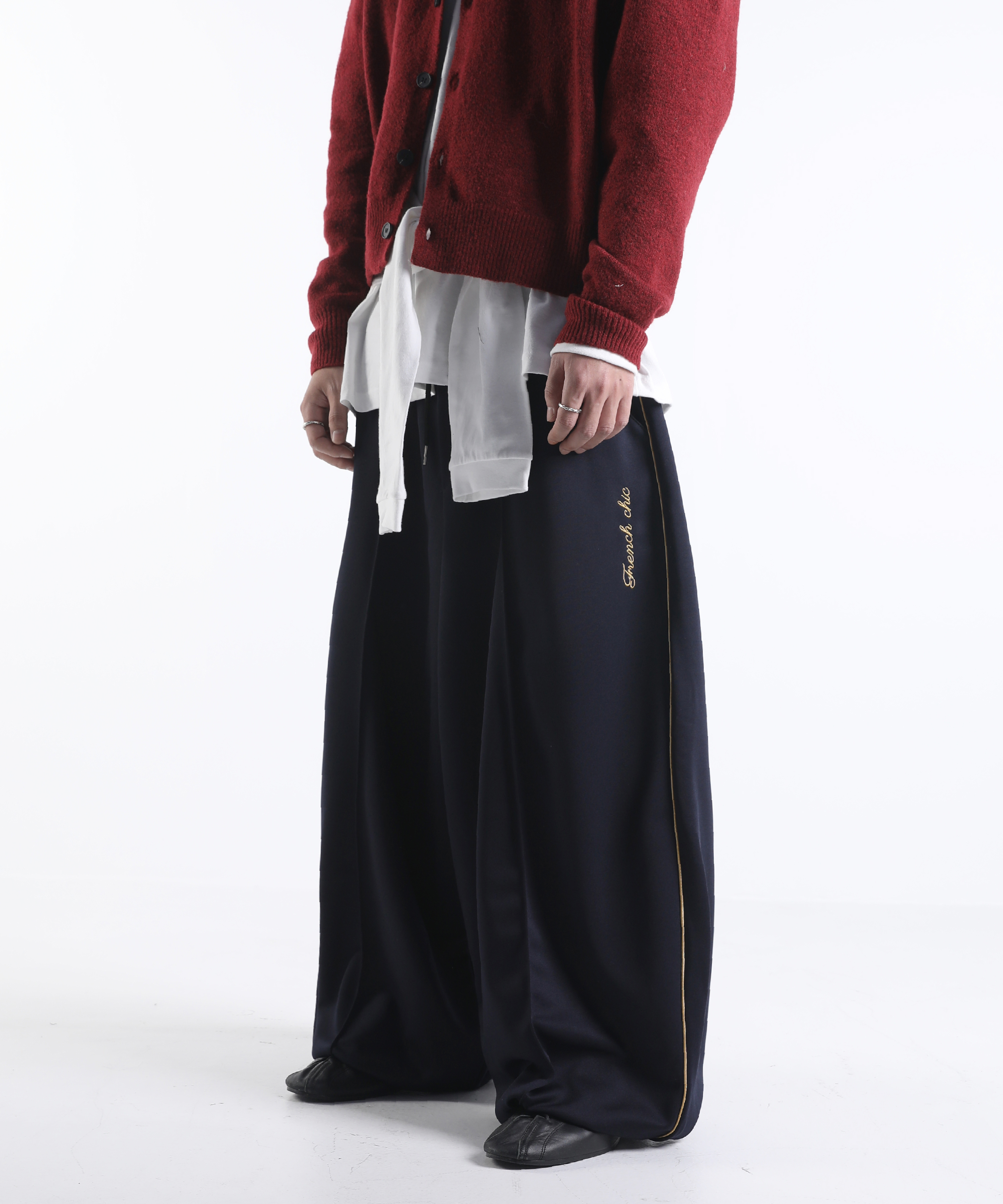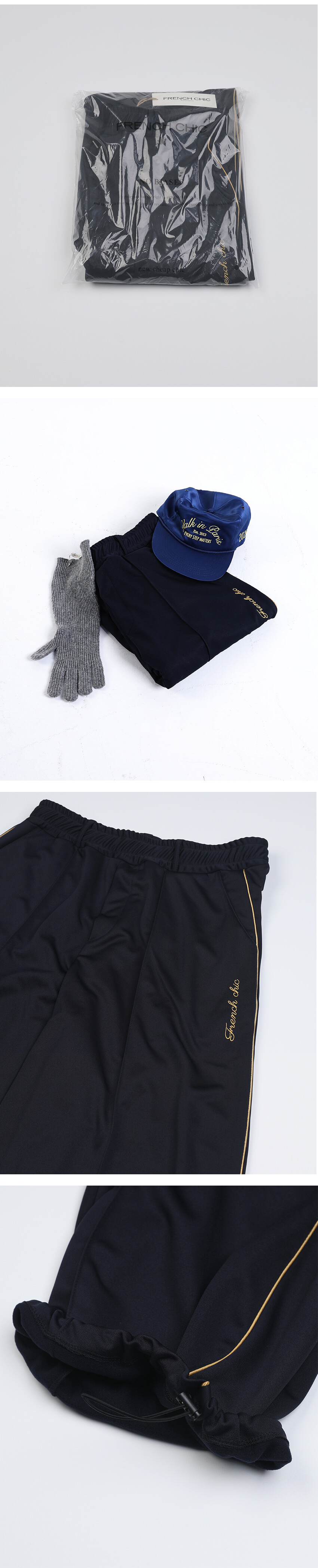 이번에 소개드릴 제품은 와이드한 실루엣을 기반으로 여유롭게 떨어지는 핏의 프렌치 시크 트랙 팬츠입니다.