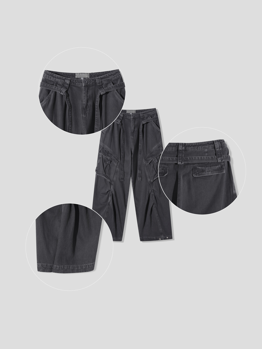 벨티트 ,카고 포켓 ,앞판 절개라인 턱, 밑단 스냅 디테일