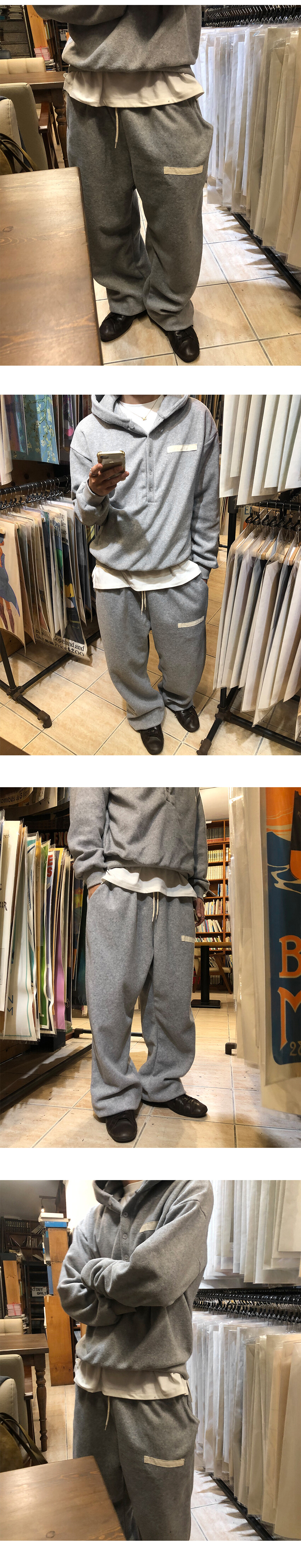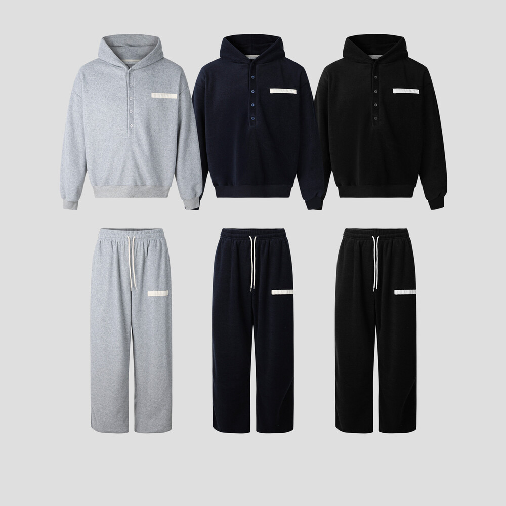 따뜻한 후리스 원단으로 제작된 팬츠와 후드 세트입니다.