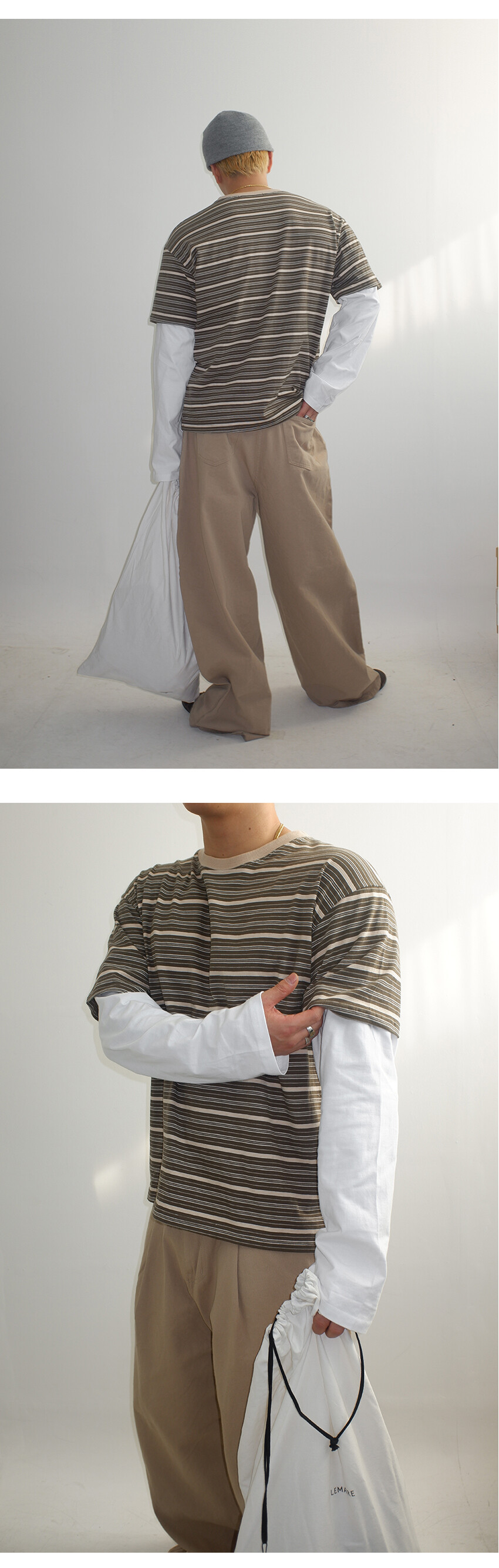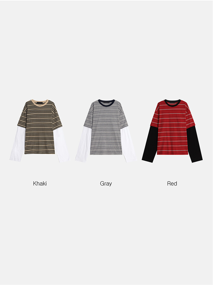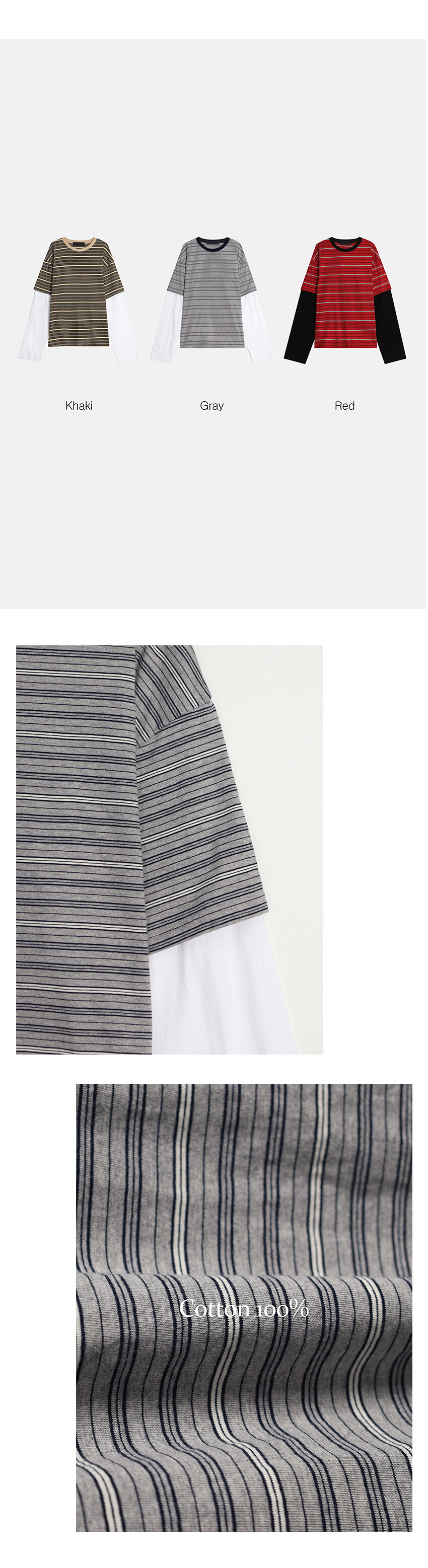 반팔 위에 긴팔을 입은 듯한 레이어드 구조로한 벌만으로도 스타일이 완성되는 스트라이프 긴팔 티셔츠입니다.