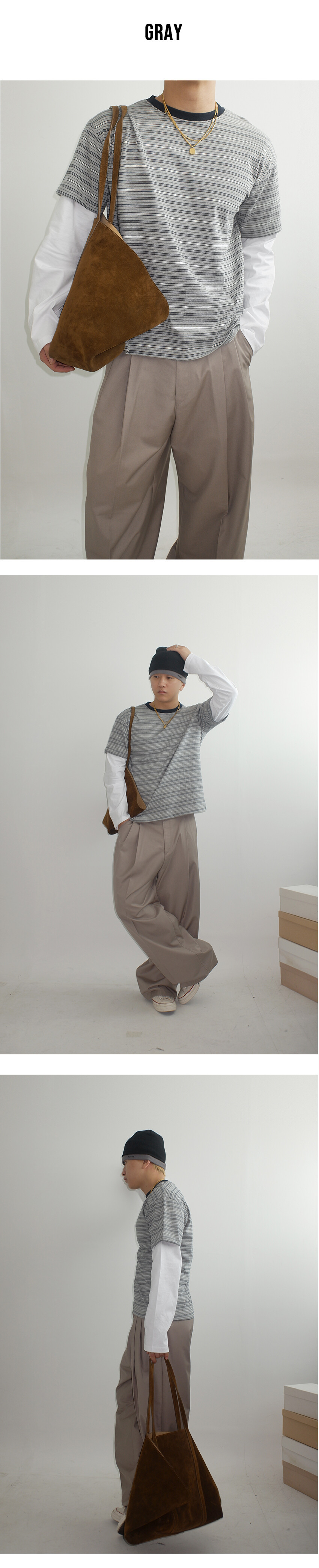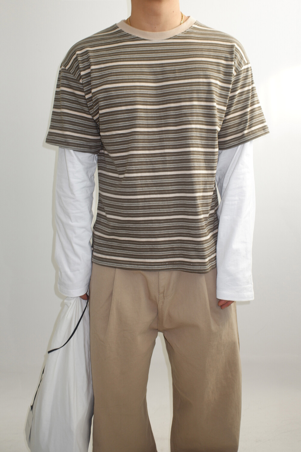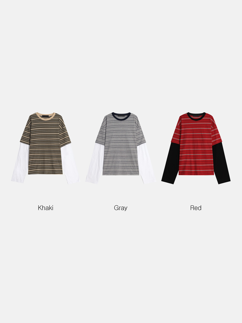 반팔 위에 긴팔을 입은 듯한 레이어드 구조로한 벌만으로도 스타일이 완성되는 스트라이프 긴팔 티셔츠입니다.