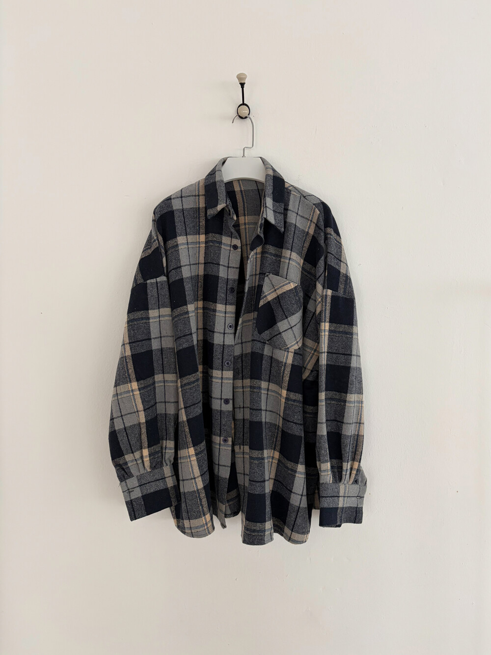 클래식한 체크 패턴의 모직 소재로 제작된 오버핏 셔츠