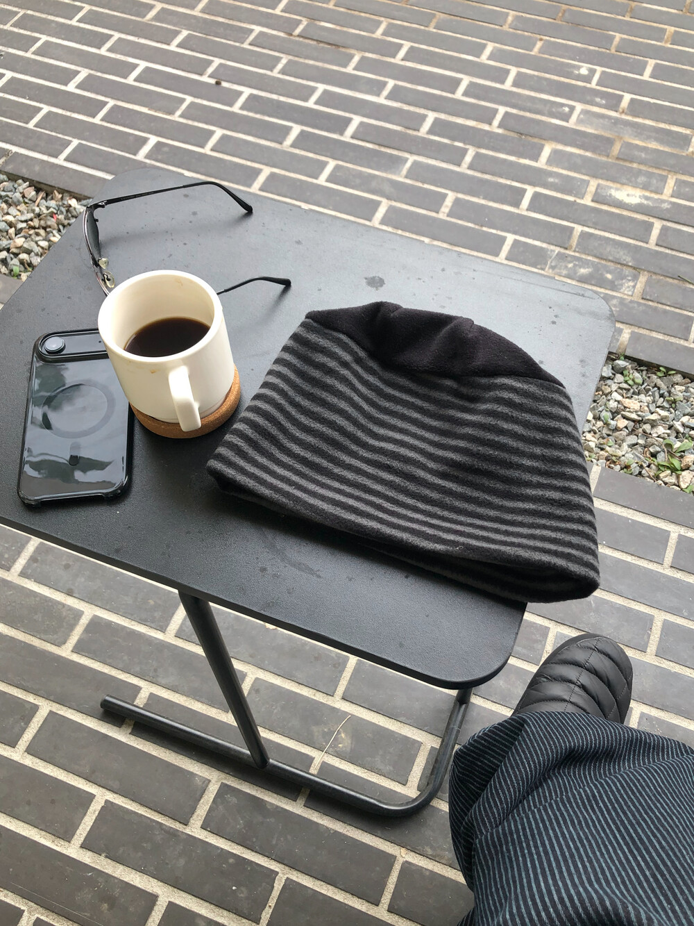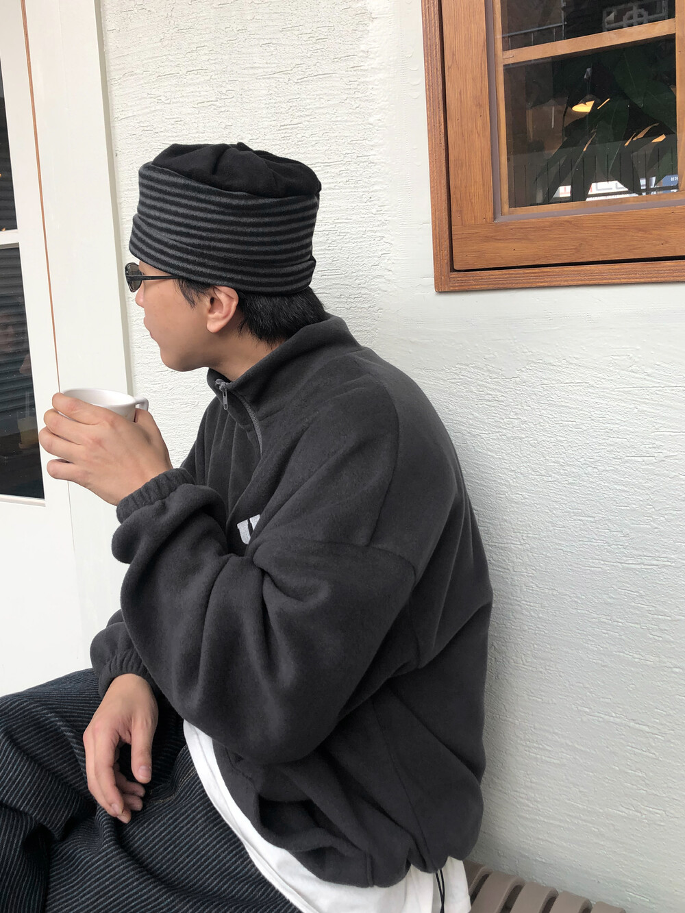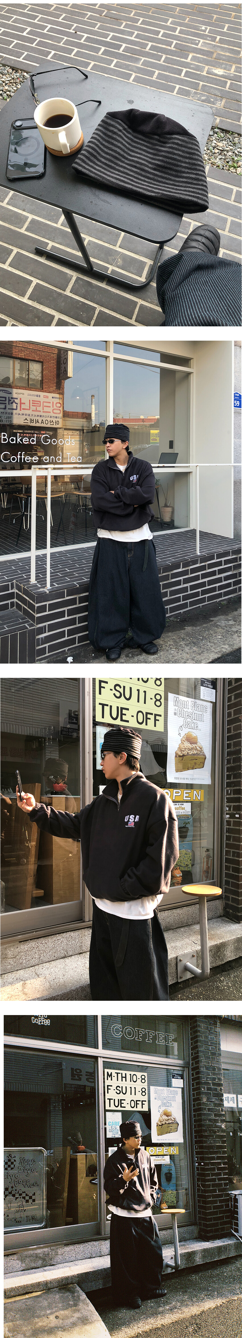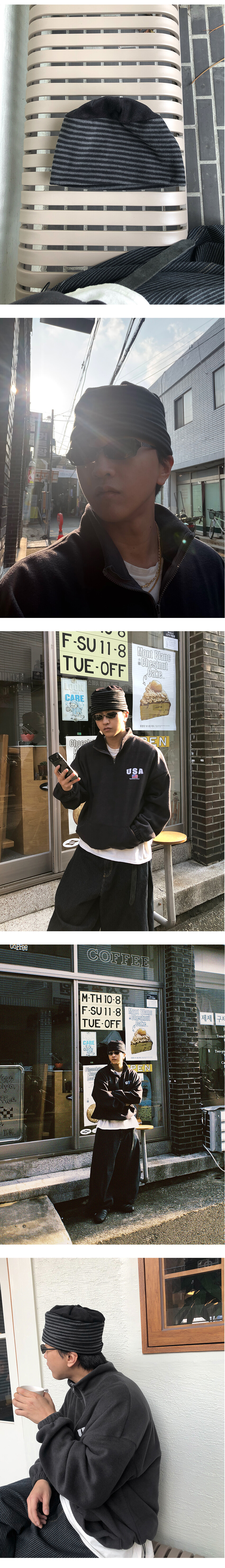 가벼우면서도 따뜻한 소재 특유의 편안한 착용감이 특징이며, 스트라이프 패턴이 룩에 자연스러운 포인트를 더해줍니다.