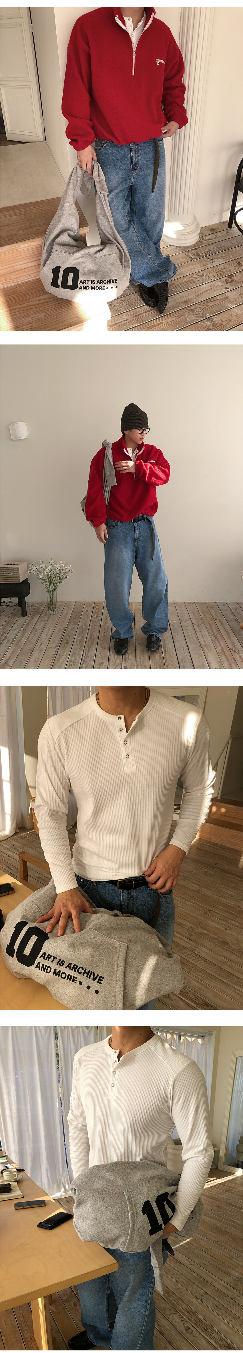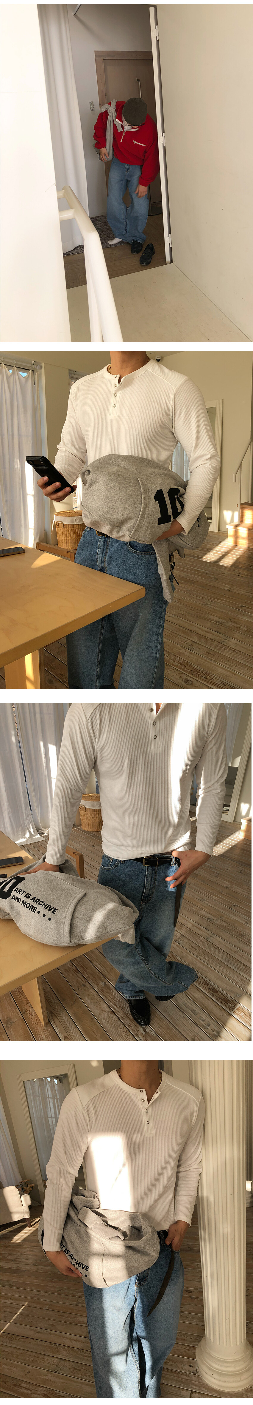 스냅 버튼 헨리넥 디자인으로 오픈 정도에 따라 다양한 무드 연출이 가능하며