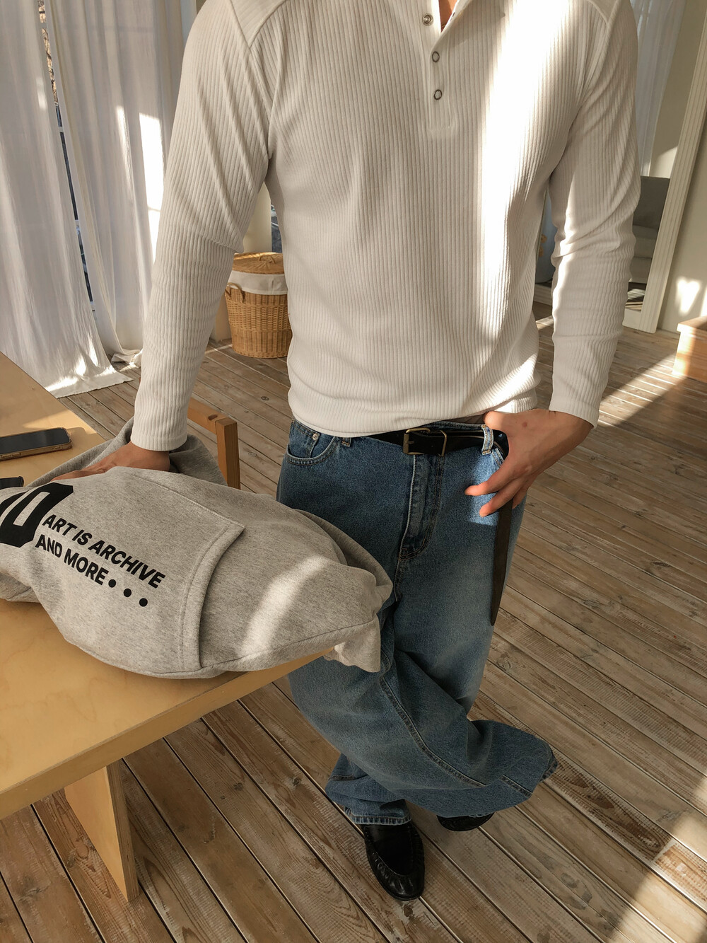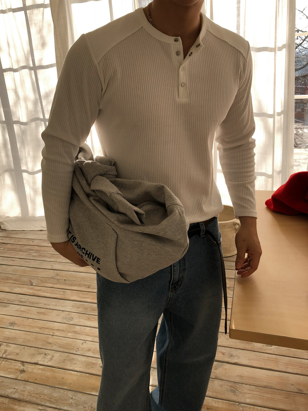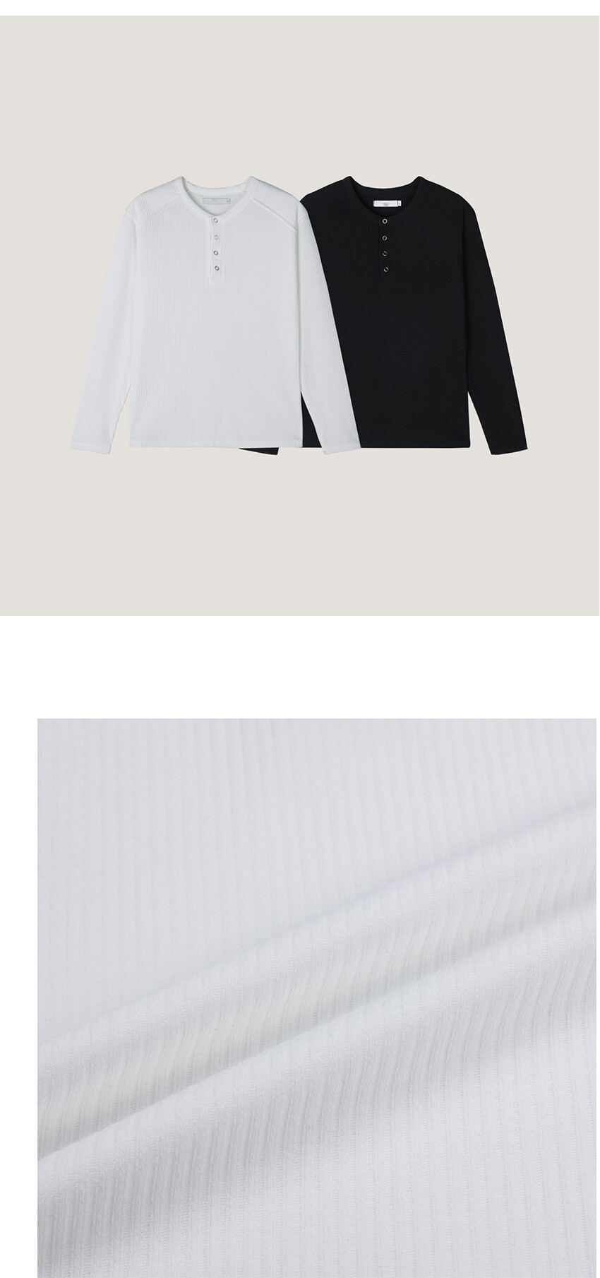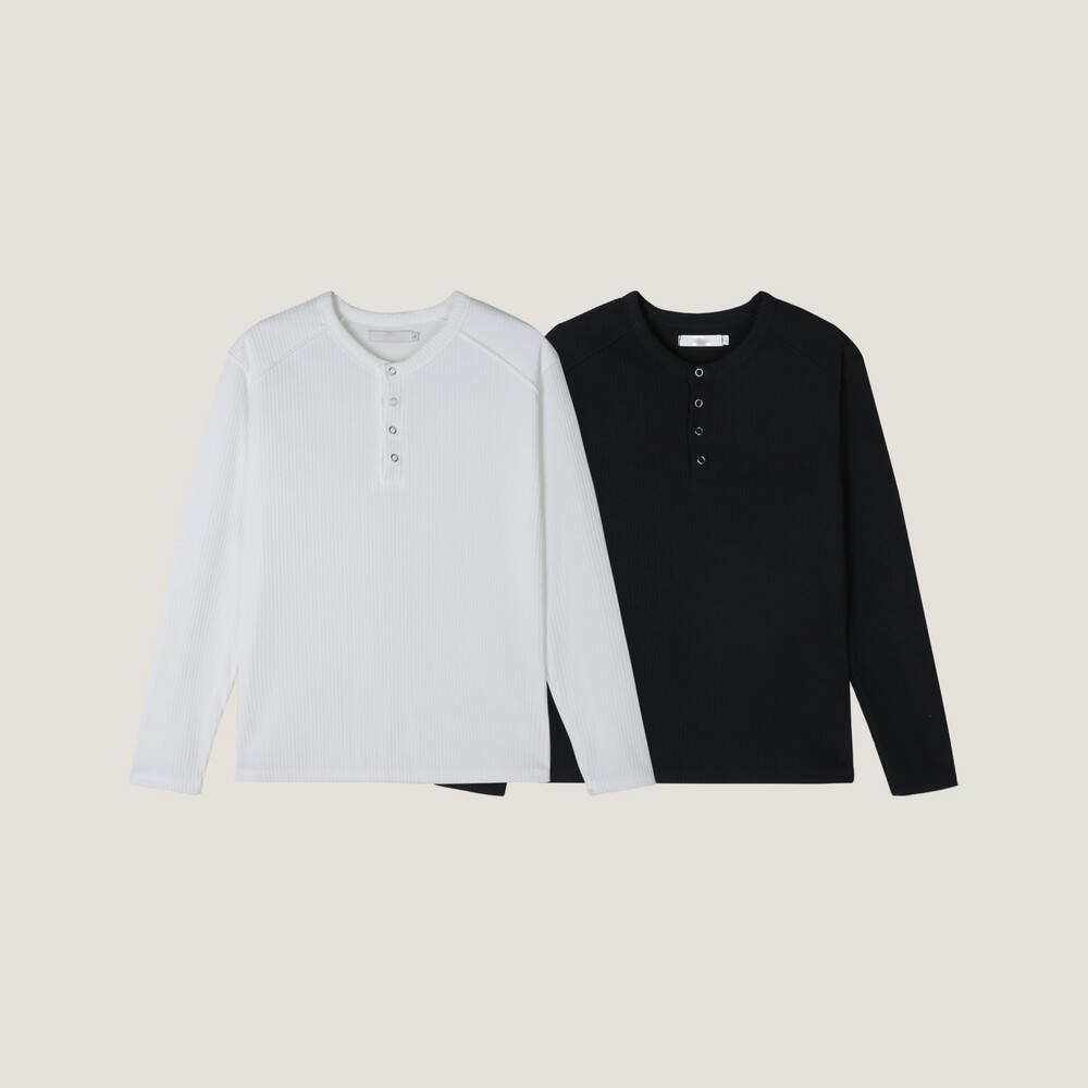핏한 실루엣으로 제작된 골지 헨리넥 상의입니다.