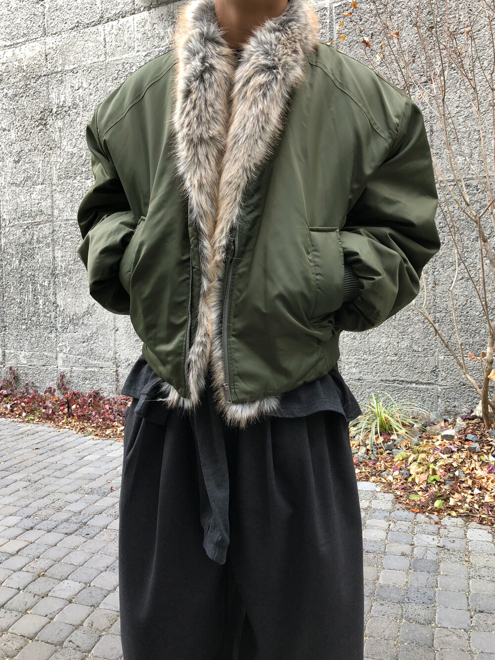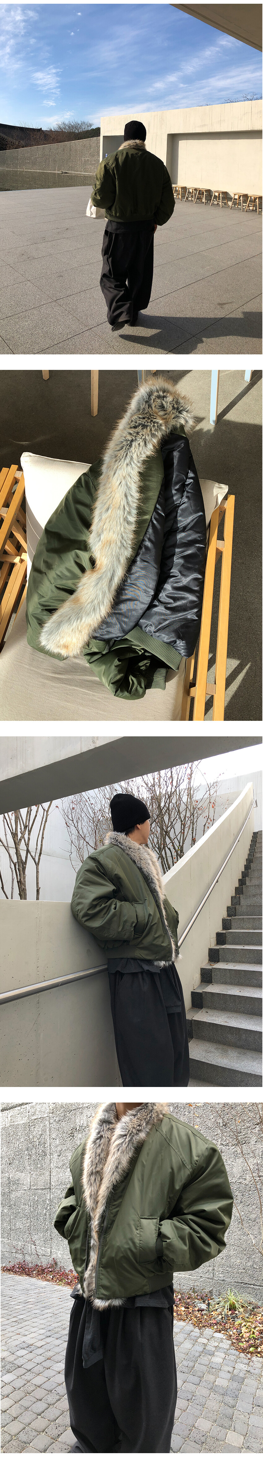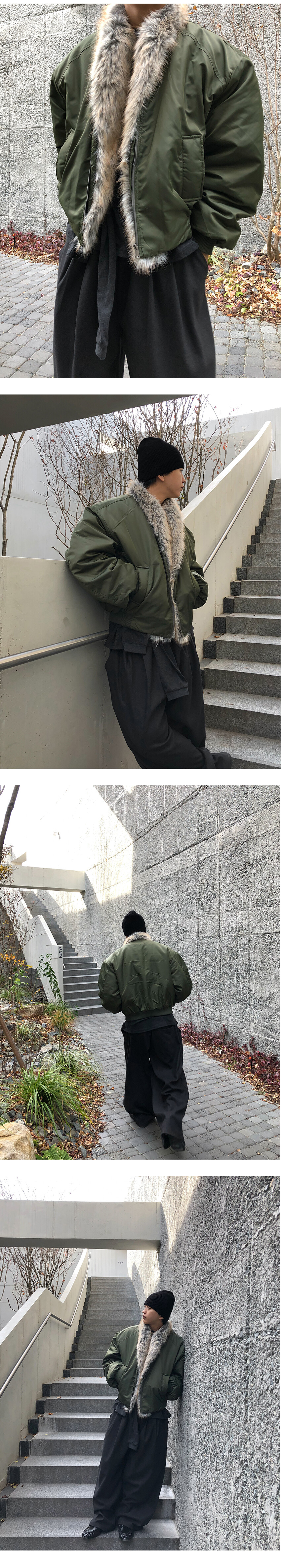 클래식한 MA-1 플라이트 점퍼를 모티브로 제작된 크롭 퍼 점퍼입니다.