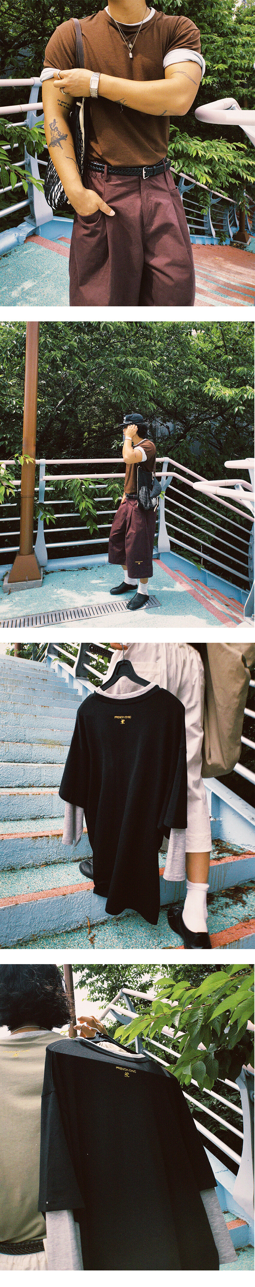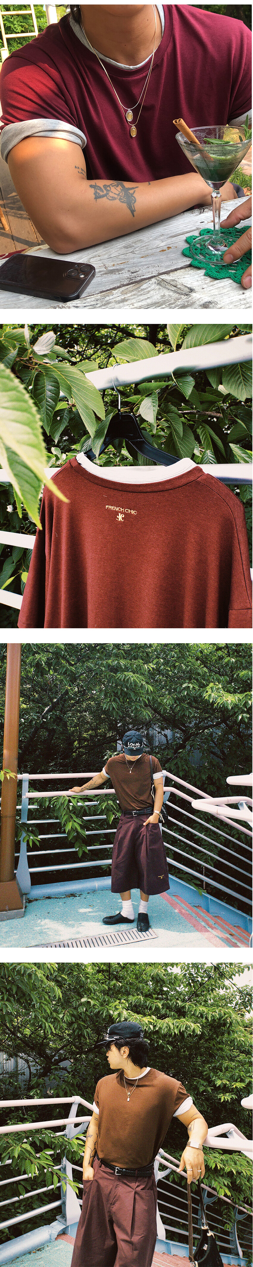 넥과 소매 부분을 이중으로 제작하여 티셔츠 두장을 겹쳐 입은 듯한 디자인으로 레이어드한 모습을 연출했습니다.