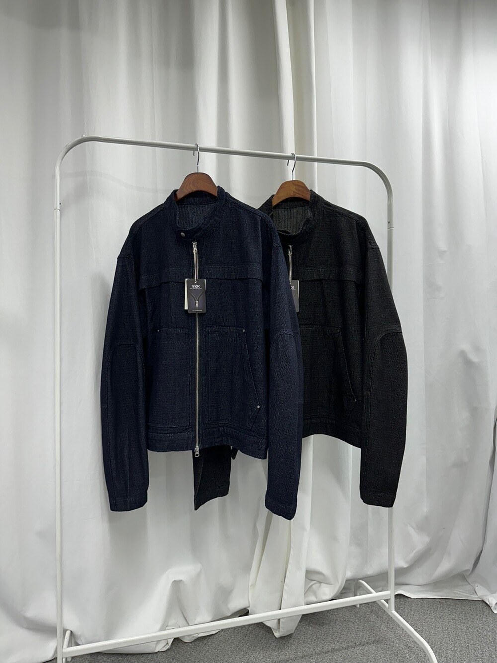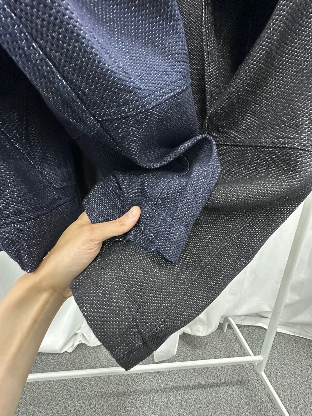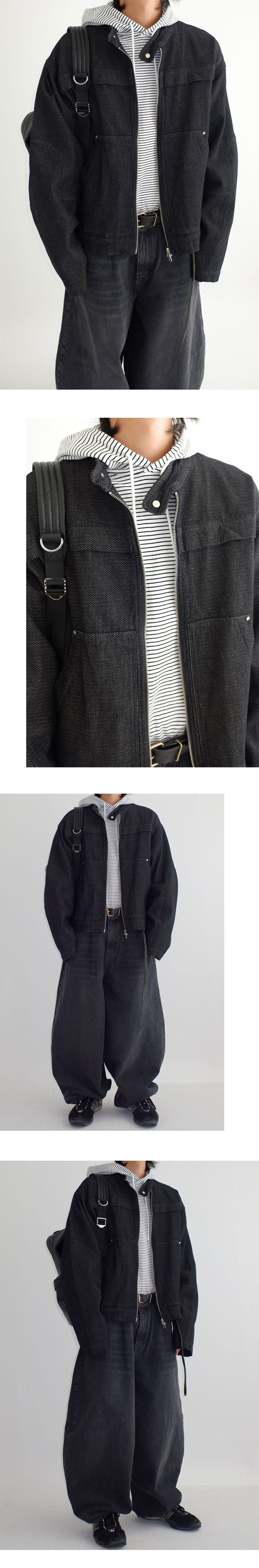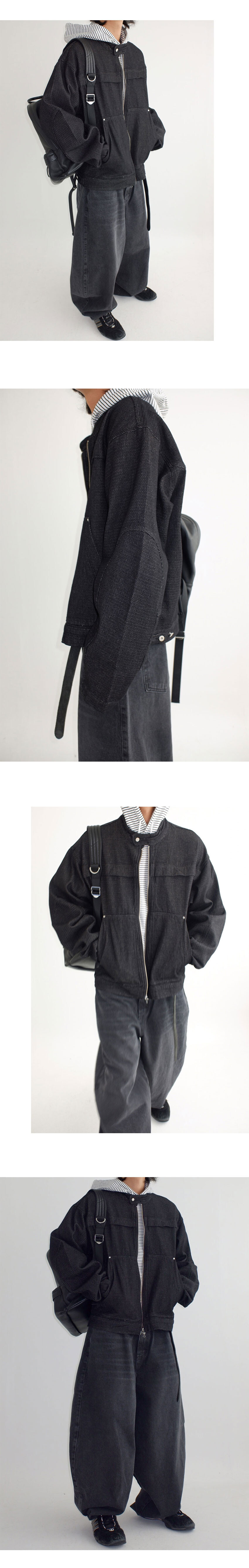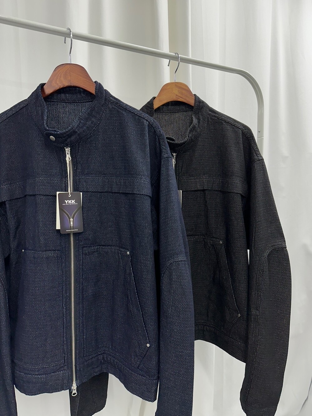 허니콤브 형태의 독특한 조직감을 가진 인디고/블랙 원단을 사용하여, 제작된 데님 라이더 자켓