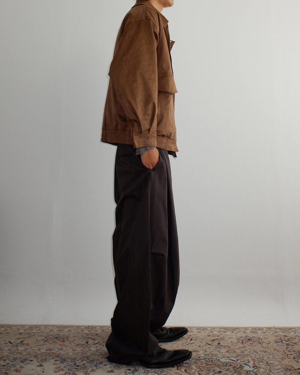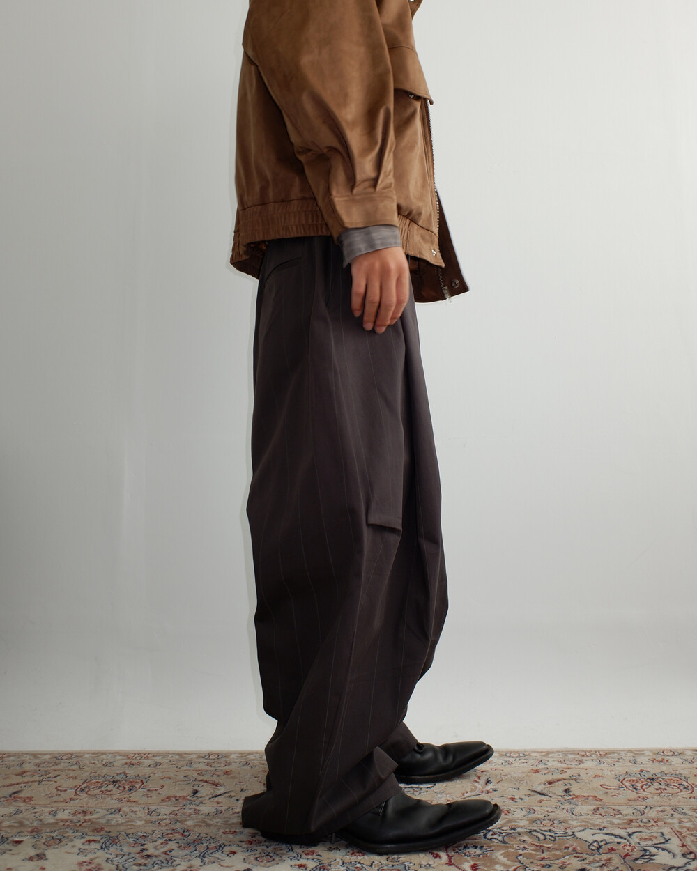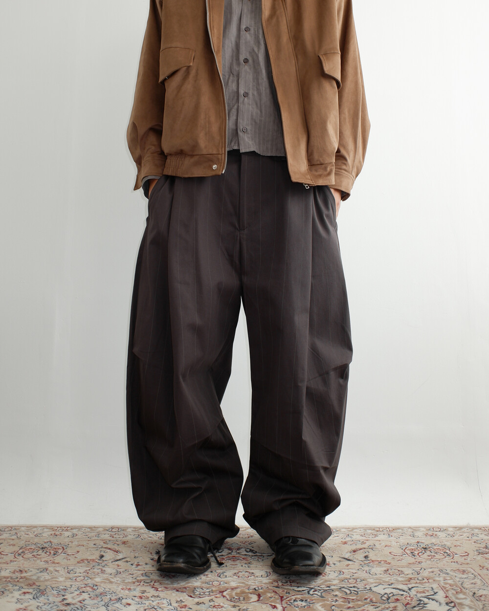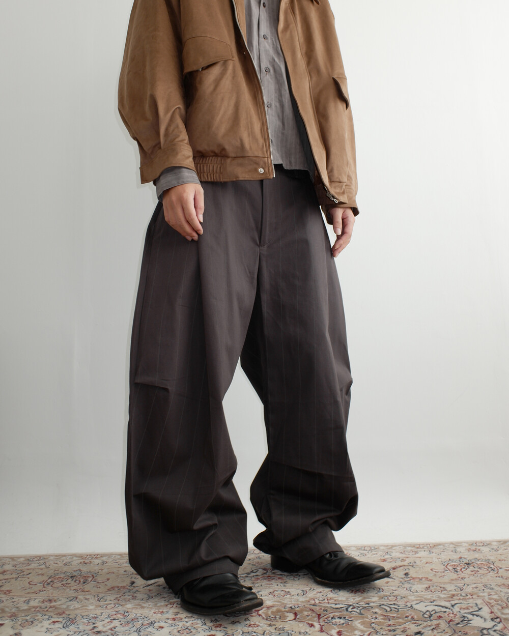 스트라이프 패턴이 돋보이는 오버 커브드 팬츠