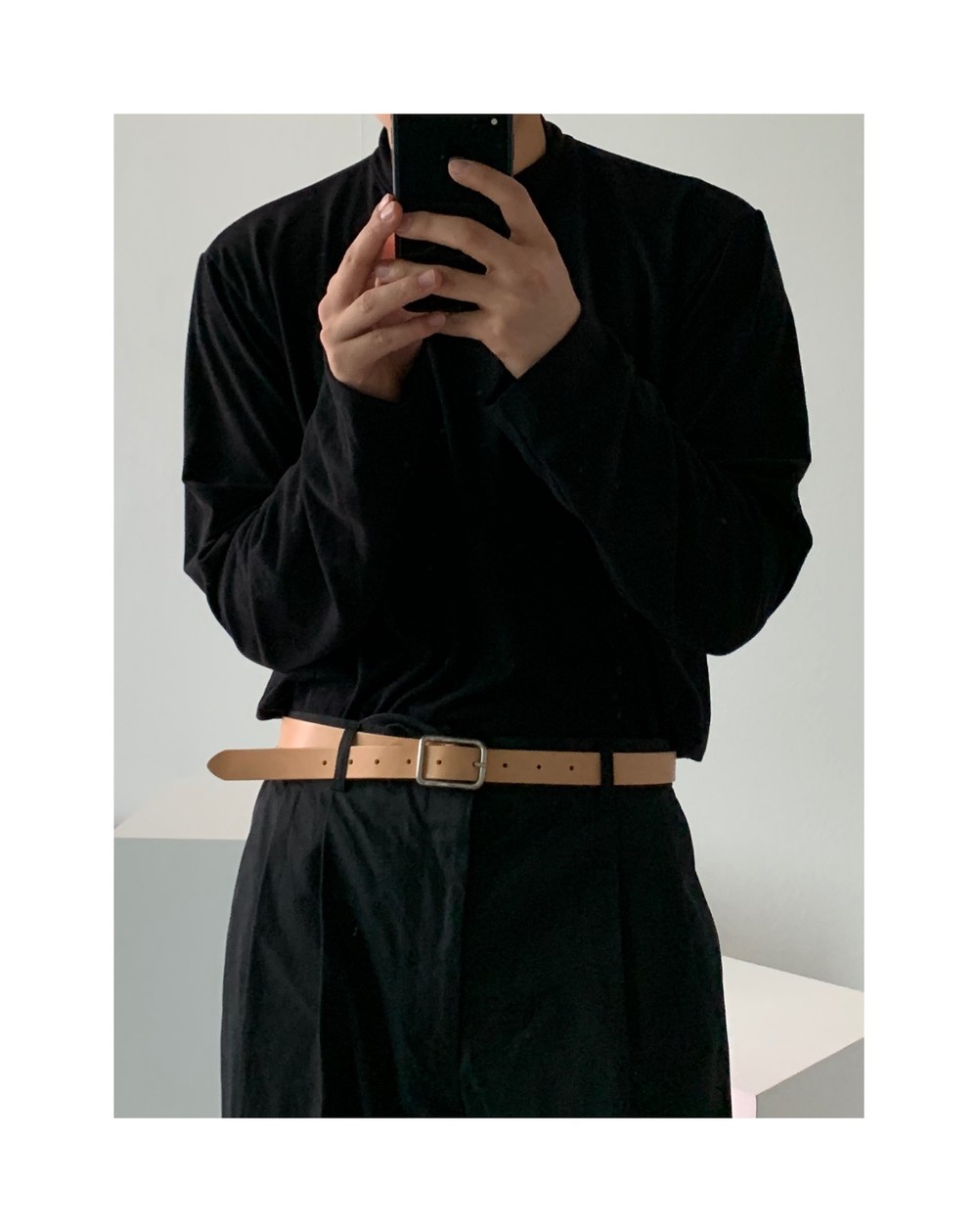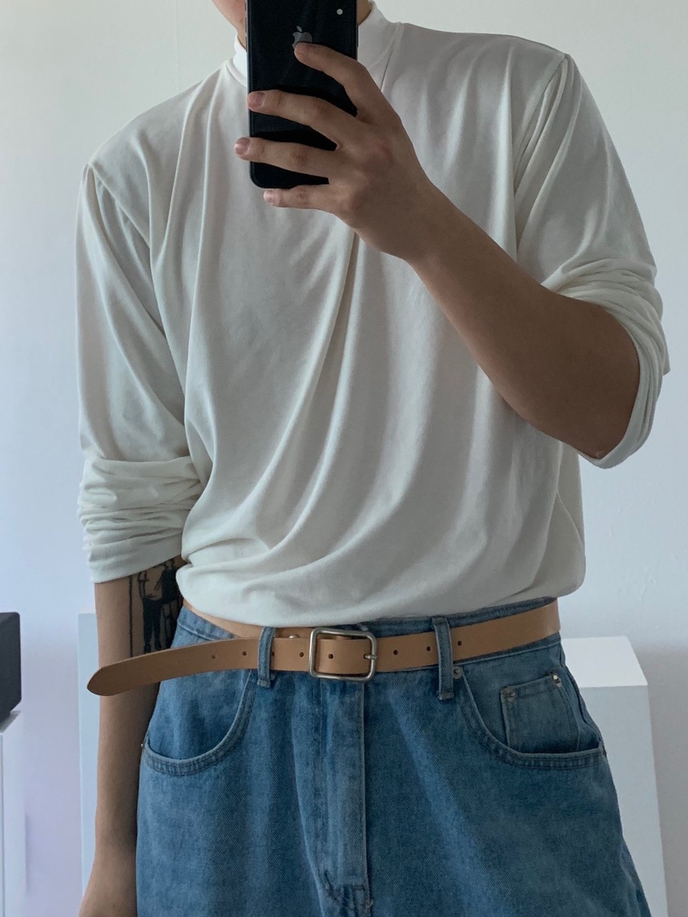 벨트 색감만으로도 포인트를 줄 수 있는 제품입니다 올블랙이나,블랙슬랙스에 흰티 한장을 걸치고 배바지로 착용할때 멋스러운 실루엣이 연출됩니다